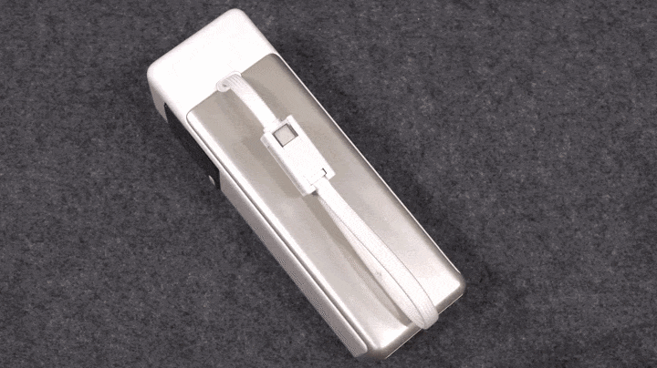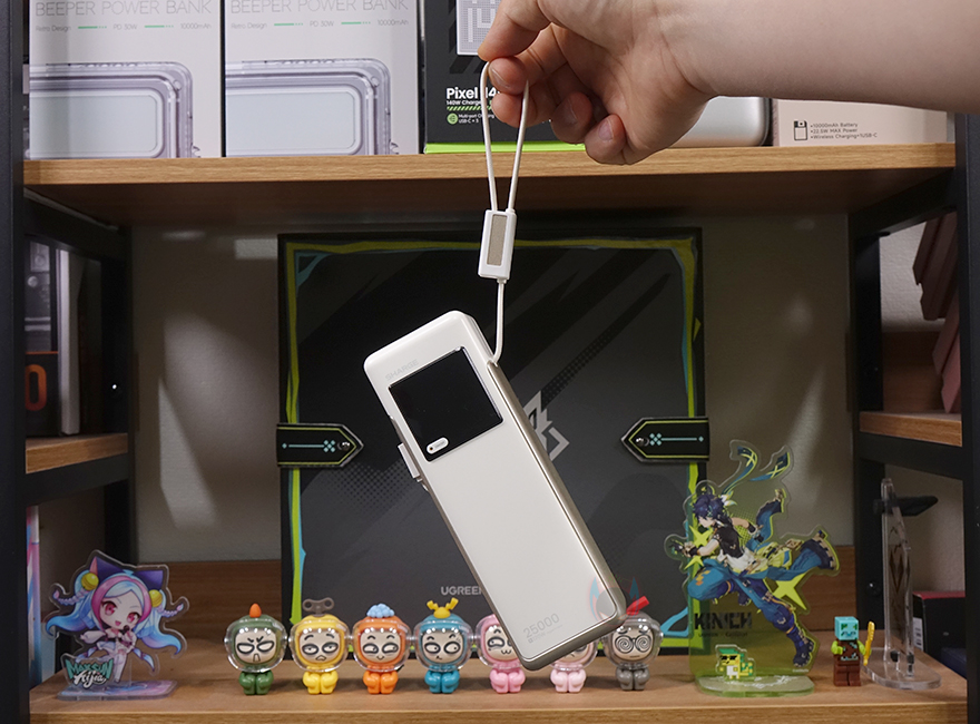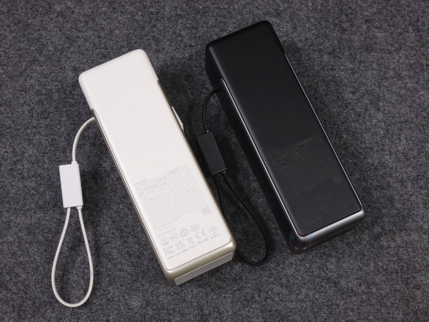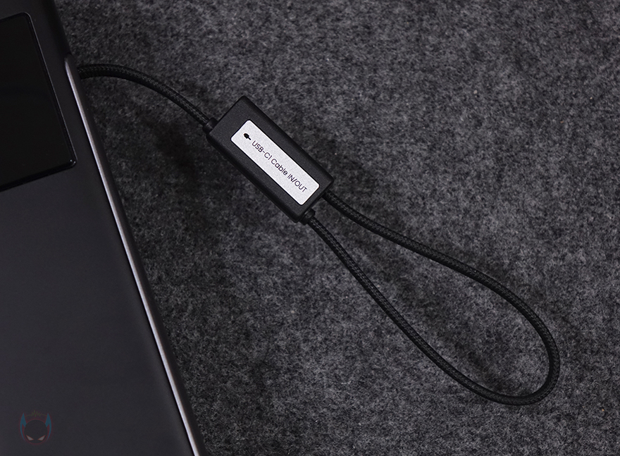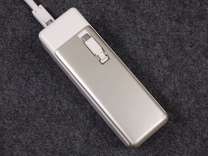전면 스마트 디스플레이를 기준으로 오른쪽 측면에는 스트랩을 확인할 수 있는데, 단순 스트랩이 아닌 충전케이블로 USB-C 1번 케이블에 해당하고, 케이블 홀더 부분에 USB-C 입/출력이라고 표기해 놨죠. 홀더에 끼워진 케이블은 위로 밀어 올리면 쉽게 빠져 충전케이블로 사용할 수 있는데, 총 245mm 길이를 가졌고, 플랫타입에 패브릭 슬리빙처리까지 더해 깔끔합니다. 사용하지 않을 때는 다시 스트랩 역할로 휴대할 때 편하게 사용할 수 있죠. 전면 기준 왼쪽 측면에는 또 하나의 충전케이블이 내장되어 있는데, 왼쪽 케이블 역시 USB-C 타입이며, USB-C 2번 케이블이고 역시 입/출력 모두 지원합니다. 특히, 왼쪽 충전케이블은 줄자처럼(Retractable) 길이조절이 되는 타입으로 총 580mm 길이를 가졌고, 역시 패브릭 슬리빙처리가 되어 있습니다. 또한, 수납될 때는 마그네틱(Magnetic) 방식으로 본체에 부착됩니다.