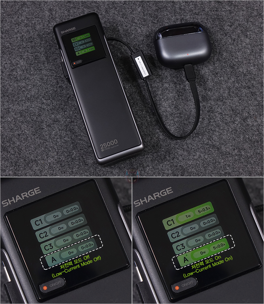 끝으로, 일반적인 보조배터리들은 충전 출력 전류가 약 60mA 이하이면, 외부기기 충전을 하지 않거나 전원이 꺼집니다. 그래서, 저전력 충전모드를 갖추는 제품들이 있는데, HyperTower 170 보조배터리 역시 최신 제품답게 저전력 충전모드(Low-Current Mode)를 지원합니다. 전원 켜고, 전원버튼을 연속 2번 누르면 저전력 모드가 활성화되는데, On/Off 확인은 케이블 및 포트별 충전속도 표시에서 USB-A 포트의 배경화면이 그린색상으로 바뀌면 저전력 모드 On 상태입니다. 물론, 반대로 전원버튼을 연속 2번 다시 누르면 저전력 모드 Off가 되고, 이때 USB-A 포트의 배경화면도 그린색상이 꺼지죠. 참고로, 저전력 모드에서 2시간동안 충전없이 대기상태로 있어도 모드가 자동으로 Off됩니다. 그리고, HyperTower 170 보조배터리를 외부 충전기기를 통해 충전하면 최대 100W까지 지원하기 때문에 100% 충전까지는 1시간도 채 걸리지 않죠.