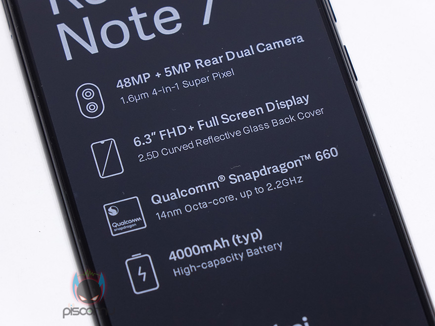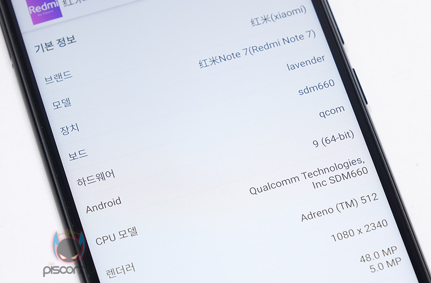 그럼, 본격적으로 홍미노트7을 살펴보는데요, 일단 크기는 제가 사용하고 있는 포코폰보다 눈으로 봤을 때 조금 더 길다라는 것을 알 수 있죠. 좀 더 정확하게는 폭도 조금 넓어졌구요. 무게와 두께는 줄어들었습니다. 확실히 만져보면 가볍다라는 느낌이 들더라구요. 그리고, 박스 후면에서 봤던 간략한 스펙 사양도 홍미노트7 기본 보호필름에도 표기가 되어있어서 다시 확인할 수 있습니다.