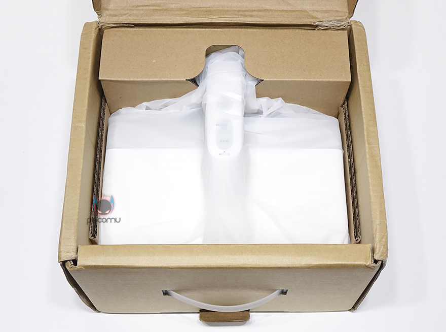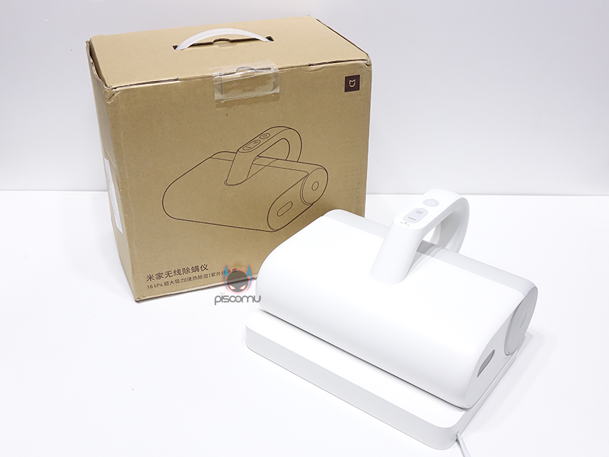 제품박스는 샤오미 박스치고는 조금 허술하죠?! 하지만, 이게 샤오미 순수브랜드의 특징이기도 합니다. 샤오미나 미지아 브랜드는 최대한 제품단가를 낮출 수 있는 부분을 박스부터 적용하는 경우가 흔합니다. 그리고, 제품 박스에도 단순하게 디자인 형태와 16000kPa 흡입력, 제습기능, UV살균 기능 딱 3가지 핵심 기능만 표기해놨죠. 이부분은 뒤에서도 다시 언급하겠지만, 현재 동급 모델 중에 제습기능까지 있는 집먼지진드기는 드뭅니다. 그리고, 이동시 편의를 위해 박스 손잡이도 처리되어 있습니다.