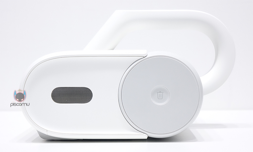 그리고, 뒷부분을 보면 좌우로 각각 먼지통과 모터부분이 있는데, 왼쪽은 먼지통으로 측면에 보면 쓰레기통 모양이 그려진 버튼이 있죠?! 이 버튼을 누르고 뒤쪽으로 살짝 당기면 쉽게 먼지통이 분리됩니다. 그리고, 오른쪽 모터같은 경우에는 내부에 요즘 무선청소기 제품군이라면 대부분 적용되고 있죠. 바로 브러시리스 모터가 적용되었는데, 85,000RPM으로 작동됩니다. 이 역시 집먼지진드기 청소기 중에서는 최고치 수준입니다. 거의 무선청소기급이죠.