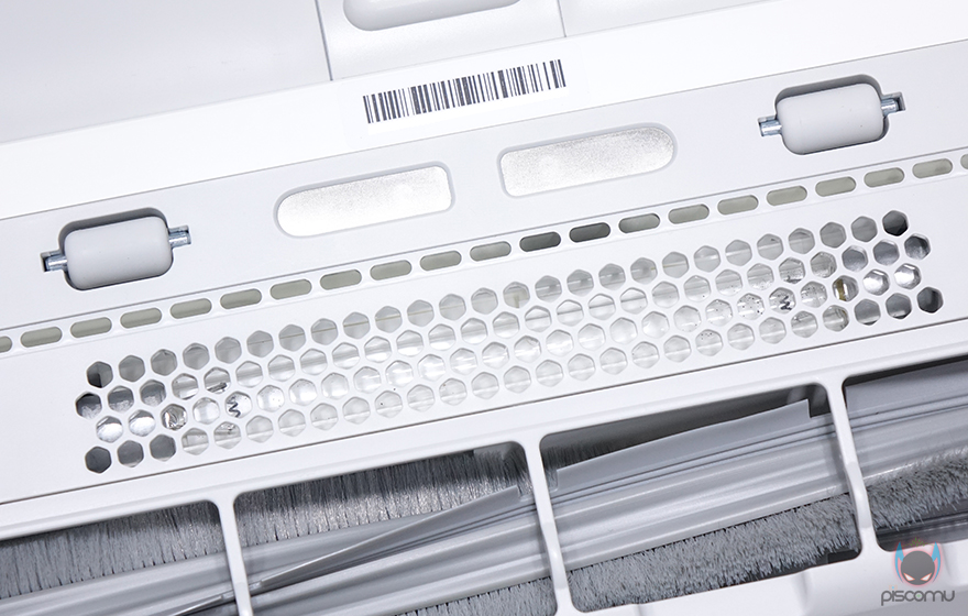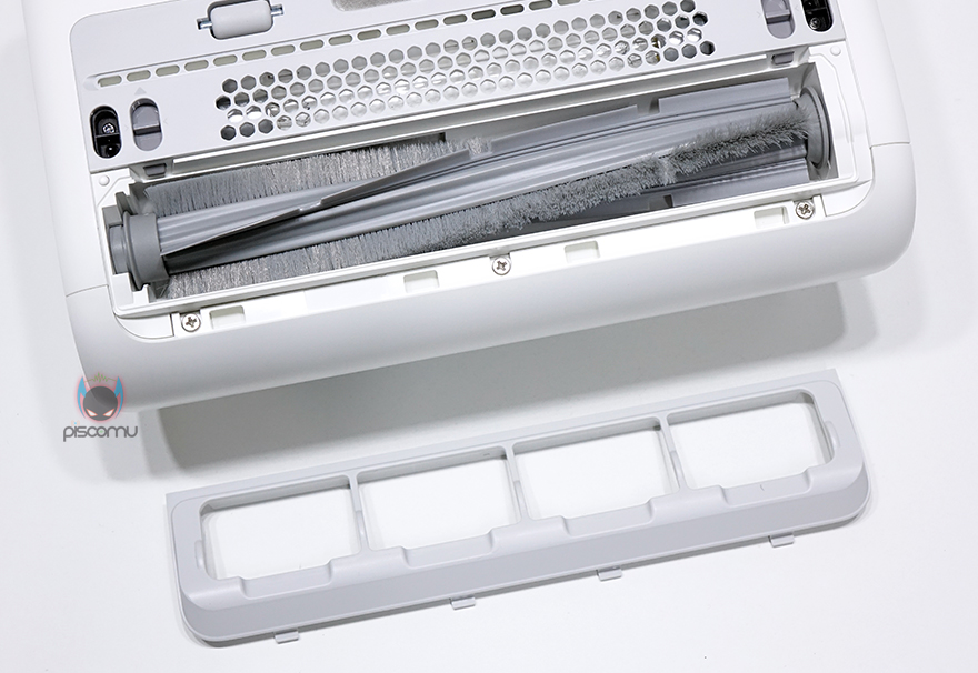 외형 끝으로, UV램프 양쪽에 보면 레버 스위치가 있는데, 레버 위에 화살표 표시대로 레버를 위로 밀어올리면 맨 앞쪽에 위치한 청소 브러쉬 가이드가 분리되고, 브러쉬도 쉽게 분리할 수 있습니다. 위에서 봤던 먼지통 분리나 분리되는 브러쉬들은 물세척으로 청소해주면 됩니다.