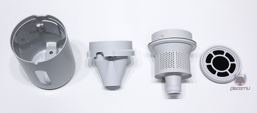 분리된 먼지통에는 총 3개의 필터가 적용되어 있는데요, 일단 벌집모양의 필터와 고밀도 스펀지 필터가 1차로 분리되고, 벌집모양의 필터에서 한 번 더 속분리가 됩니다. 그리고, 마지막으로 먼지통 위치에 본체 안쪽 그러니깐 모터쪽 부분을 보면 헤파필터가 적용된 것을 확인할 수 있죠. 그래서, 총 필터구조는 4중 필터입니다. 헤파필터는 당연히 H13 필터로 99.97% 먼지차단을 해줍니다.