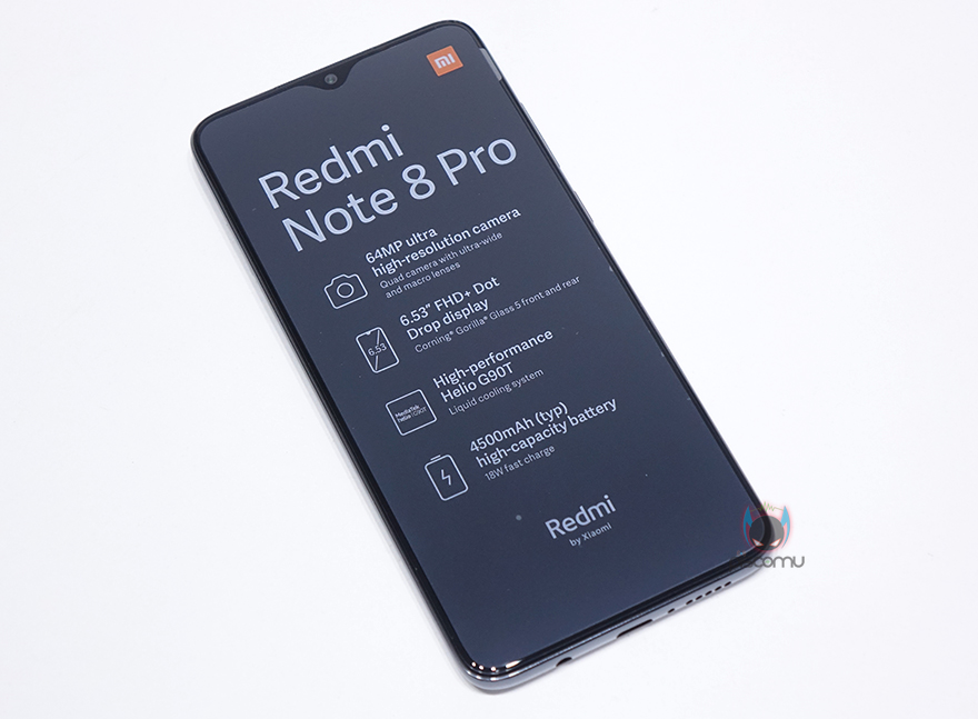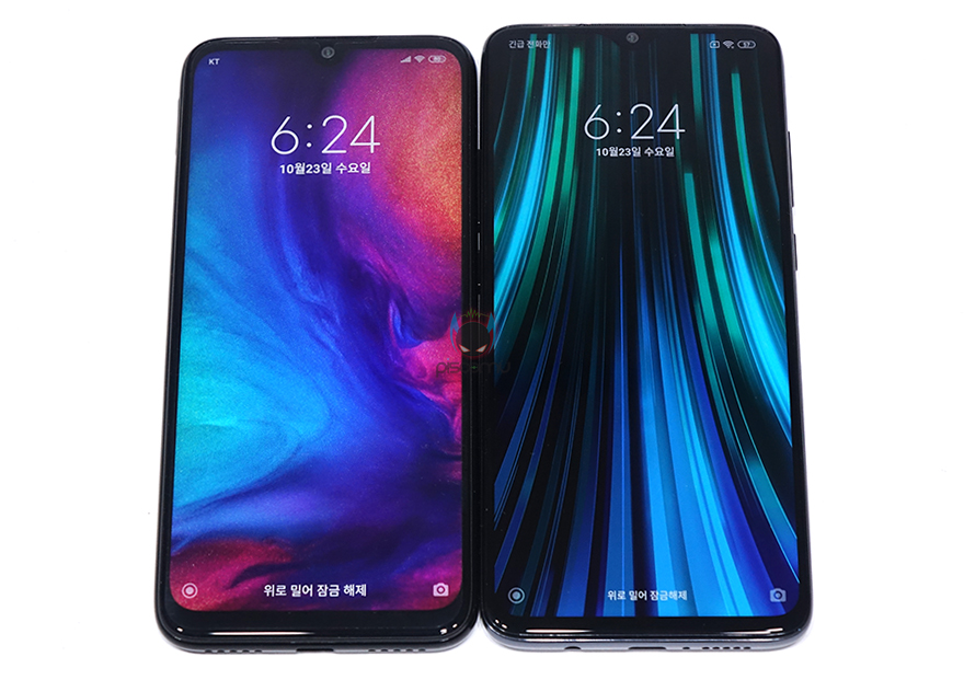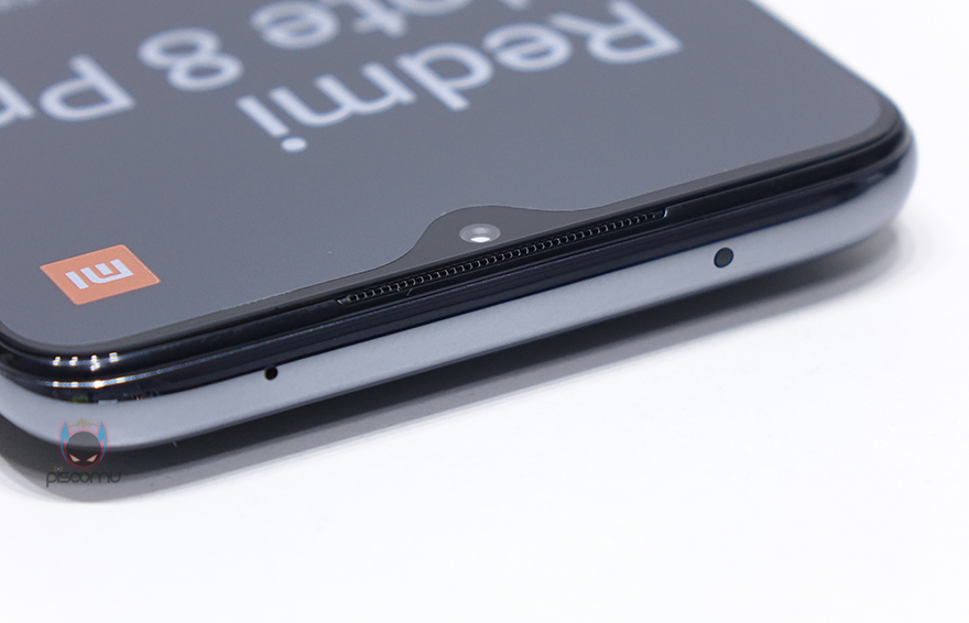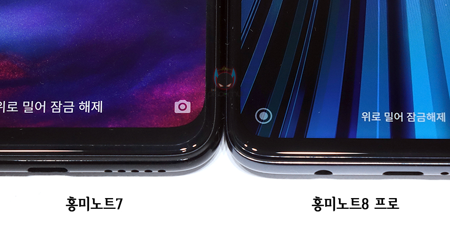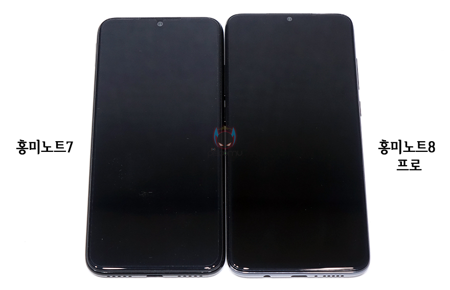 그럼, 홍미노트8 프로 외형을 본격적으로 살펴보죠. 일단 디스플레이 화면에 보호비닐이 붙어있는데, 새겨진 문구처럼 전면 디스플레이 크기는 6.53인치 2340x1080 FHD+ 해상도를 갖추고 있습니다. 이전 홍미노트7시리즈 같은 경우 홍미노트7과 홍미노트7 프로 둘 다 동일한 6.3인치 크기를 적용하고 있었던 반면에, 홍미노트8시리즈는 홍미노트8은 이전 모델과 동일한 6.3인치, 홍미노트8프로는 좀 더 커진 디스플레이를 차별을 두고 있죠. 실제로 이전 홍미노트7과 크기 비교를 해보면 좀 더 길어졌고, 폭도 좀 더 넓어졌습니다. 여기에 전체 화면 비율도 이전 홍미노트7시리즈 보다 더 넓어진 91.4%를 갖추었습니다. 참고로 홍미노트7시리즈는 81%입니다. 전면카메라 역시 이전 홍미노트7시리즈는 1300만화소였던 반면에, 이번 홍미노트8시리즈는 2000만화소로 업그레이드 되었죠.