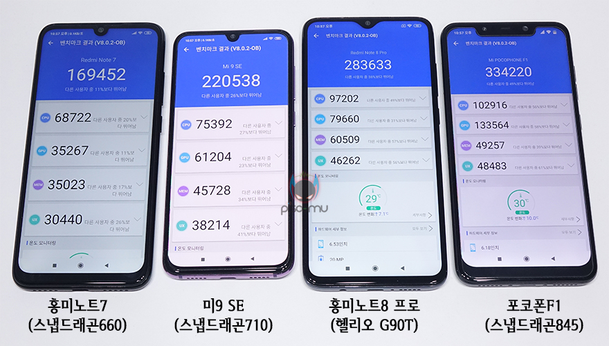 그리고, 이번 홍미노트8 프로의 후면카메라만큼 또하나의 가장 큰 특징은 바로 모바일 CPU부분이죠. 이번 홍미노트8 프로에서는 미디어텍의 #헬리오G90T 옥타(8) 코어 CPU가 적용되었습니다. 예전에는 샤오미가 중국내수용 모델들 중 일부를 미디어텍으로 적용했던 적이 있었지만, 글로벌버전까지 미디어텍 CPU를 적용한 것은 이번 홍미노트8 프로가 처음이죠. 미디어텍 역시 올해 하반기 시작과 함께 출시 발표회까지 가질 만큼 핵심 CPU로 소개된 헬리오 G90T는 퀄컴의 스냅드래곤 730보다 우세하다고 언급했는데, 실제로 제가 가지고 있는 샤오미 스마트폰 3종과 Antutu 벤치마크로 비교를 해봐도 포코폰 F1(스냅드래곤845) 다음으로 높은 성능인 것을 확인할 수 있었습니다. 해외자료까지 찾아서 확인해본 결과, 헬리오 G90T는 스냅드래곤 835보다 조금 더 우위에 성능을 가졌다고 보면 되겠습니다.