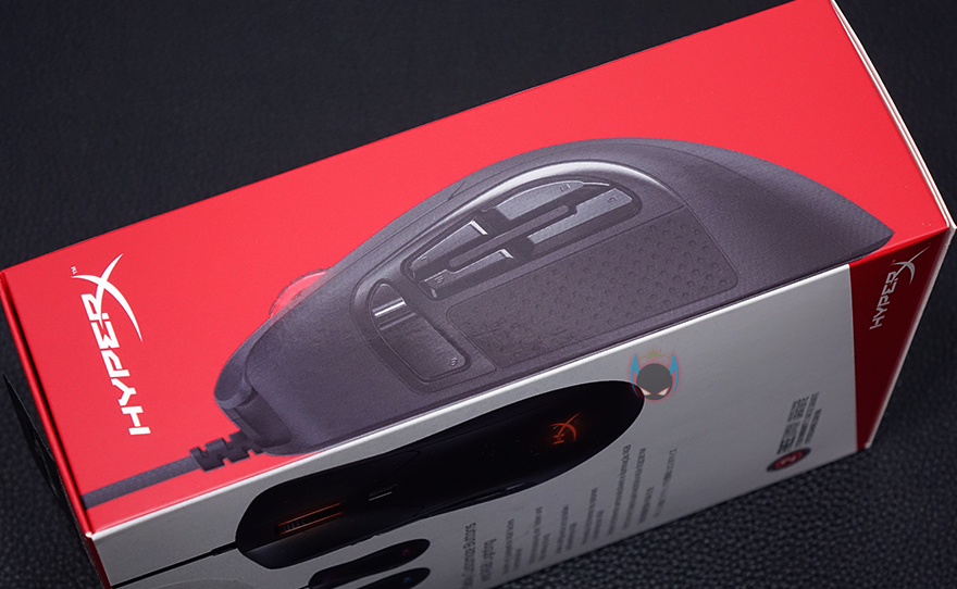 제품 박스는 기존의 하이퍼X 마우스 제품들과 큰 차이가 없습니다. 기존 제품들처럼 전면에는 모델명과 제품의 이미지 그리고, RGB라이팅효과와 하이퍼X 공융 소프트웨어 지원 표기정도를 확인할 수 있죠. 모델명 아래에는 제품의 주요 특징으로 버튼에 대한 언급을 표기해놨고, 박스 측면 한쪽에는 제품의 마우스 왼쪽 측면 이미지를 담고 있으며, 반대쪽 측면에는 제품의 기본 사양을 표기해놨습니다. PixArt사의 PMW3389센서, DPI, 가속, 스위치, 버튼 수 정도를 표기해놨고, 마지막으로 박스 뒷면에는 RGB라이팅 이미지를 담고 있는데, 휠-버튼과 로고부분에 효과가 있다라는 것을 미리 알 수 있죠.