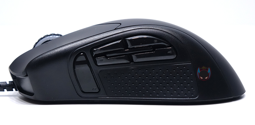 손바닥과 맞닿는 팜-레스트 부분에는 로고가 새겨져 있는데, 역시 이미 박스에서 확인했듯이 RGB라이팅효과를 볼 수 있는 부분이고, 마우스 양쪽 측면에는 미끄럼방지 및 그립시 접지력이 높도록 고무패드가 적용되어 있습니다. 또한, 왼쪽 측면에는 추가 버튼들이 적용되어 있는데, 이 제품의 가장 큰 특징으로 총 5개의 버튼이 적용되어 있고, 버튼마다 번호가 표시되어 있습니다. 버튼에 표시된 수는 8까지인데, 기본 좌우 버튼과 DPI 버튼을 포함하면 기본 8개 버튼인데, 휠-버튼이 중앙, 좌우로 버튼 역할을 할 수 있어서, 뒤에서 확인하겠지만, 프로그램을 통해서 총 11개의 버튼 설정을 할 수 있습니다.