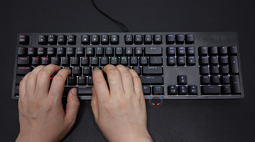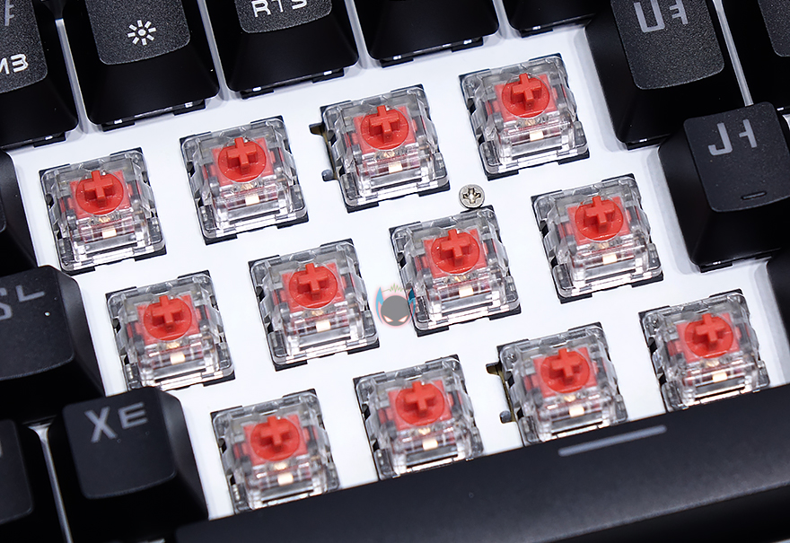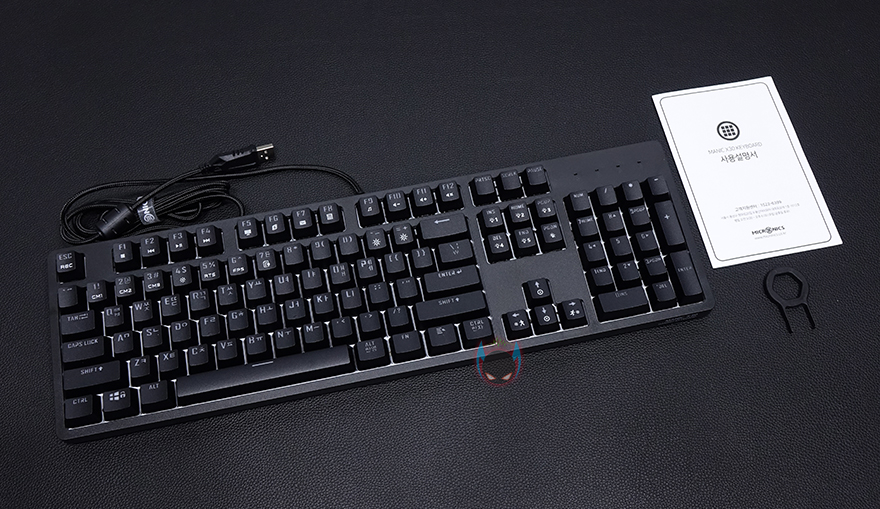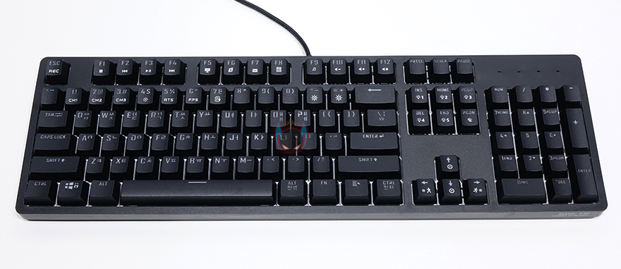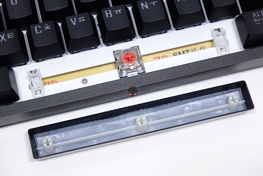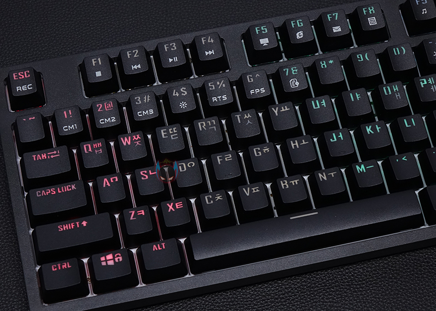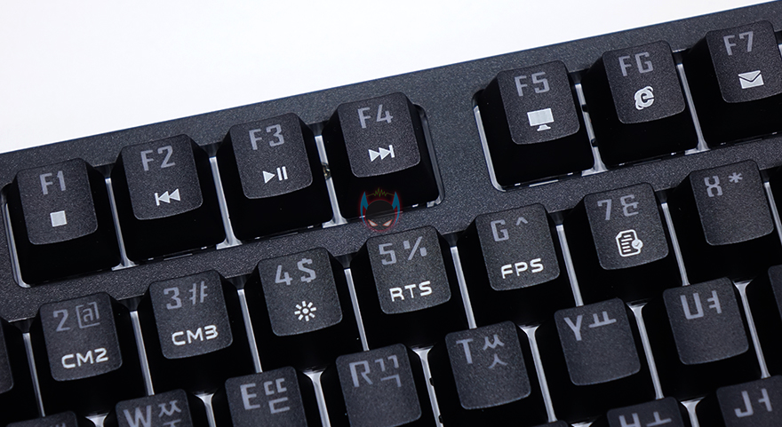 좀 더 자세히 살펴보면, 키-캡은 ABS재질에 이중사출 방식으로 처리되어 있으며, 부가 기능 표시들은 일반적인 프린팅 인쇄로 처리되어 있습니다. 그리고, 스위치는 이미 앞서 언급했듯이 마이크로닉스에서 직접 개발한 마닉 스위치가 적용되어 있는데, 마닉 스위치는 청축, 갈척, 적축 3가지로 개발되었는데, 국내 소비자들에게 흑축이 일반적으로 인기가 없다라는 점에서 3가지 스위치로만 개발되었다라는 점은 반영을 잘 했다고 볼 수 있고, 마닉 적축은 체리 적축처럼 키를 누를 때 걸리는 클릭감 없이 스무스하게 들어가는 느낌 그대로를 전달해줍니다. 이 외에도 스페이스-바 같은 긴 키들의 스테빌라이저는 체리식으로 윤활처리도 충분히 사용되었습니다.