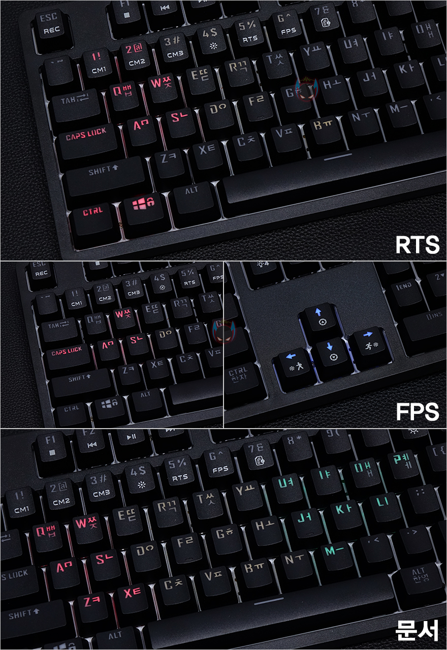그리고, 또다른 Fn(펑션)키와 사용하는 숫자1~7키까지는 LED지정모드로 일단 숫자4키는 전체 밝기, 숫자5는 RTS장르 모드, 숫자6은 FPS장르 모드, 숫자7은 문서 모드로 알파벳과 자모음부분에만 LED가 지정되어 있습니다. 그리고, 숫자1~3키까지는 커스텀모드로 사용자가 직접 지정할 수 있는데, 사용법은 숫자1~3키 중 하나를 선택하고, ESC키를 누르면 숫자키패드 위에 LED 인디케이터가 깜빡이는데 이때부터 저장모드로 사용자가 원하는 키들을 한 번씩 누르면 켜지고, 다시 한 번 누르면 꺼지는 방식으로 각 키들의 LED를 사용자가 선택 지정할 수 있습니다. 그리고, 지정이 끝나면 다시 ESC키를 눌러서 저장하면 선택한 숫자1~3키에 저장이 됩니다.