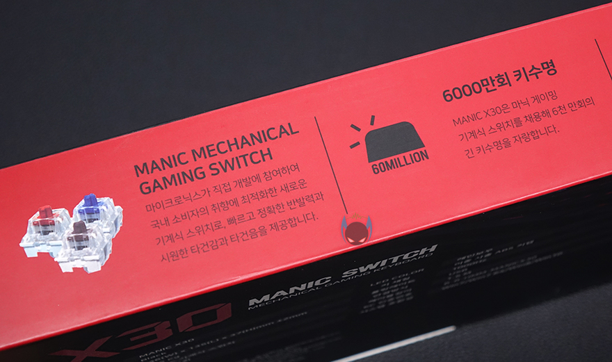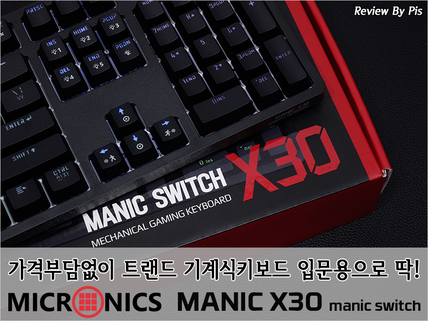 요즘은 기계식 키보드가 대중화 되면서 이제는 멤브레인 키보드보다 기계식 키보드를 사용하는 분들이 더 많아졌죠. PC방 같은 곳에서도 요즘은 기본적으로 기계식 키보드로 사용하고 있구요. 하지만, 기계식 키보드가 대중화가 된 가장 큰 이유는 가격이 많이 저렴해졌기 때문입니다. 예전에는 기계식 키보드의 원조인 독일 체리 스위치를 사용해야했기 때문에 단가 자체가 높았는데, 라이센스가 해제되고 나서부터는 중국의 저렴한 스위치들 나오면서 가격이 많이 내려갔죠. 최근에는 키보드 제조사들마다 자체 스위치를 개발해 적용하는 경우도 점점 늘어나고 있는데, 국내에도 이런 브랜드가 있습니다. 바로, 마이크로닉스죠. 마이크로닉스는 2년 전부터 마닉(MANIC)이라는 스위치를 개발해 자사 제품에 적요하기 시작했는데, 오늘은 그 중 하나인 MANIC X30 모델을 한 번 살펴보도록 하겠습니다.