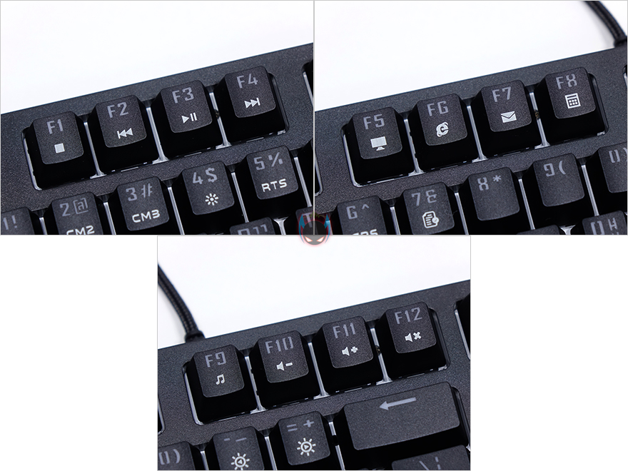 마이크로닉스 MANIC X30 마닉축 기계식키보드 역시 요즘 기계식키보드 트랜드답게 FN(펑션)키 조합의 부가 기능들을 지원하고 있는데, 윈도우-키 잠그/해제를 기본으로 Insert~PageDown까지의 특수키 6개는 LED 모드와 LED Off 기능을 가지고 있으며, 방향키는 상하는 밝기조절, 좌우키는 모드속도조절 기능으로 둘 다 4단계식 조절이 되고, 모드의 방향전환도 가능하게 -와 +키로 지원을 해주고 있습니다. 이외에도 숫자 1~7까지 키는 커스텀 모드 3가지와 전체 밝기, RTS, FPS, 문서 모드까지 총 7개의 지정 모드를 지원하고 있습니다. LED 백라이트 기능 지원 외에도 멀티미디어 핫-키와 프로그램 실행 부가 기능들도 지원을 해주고 있는데, F1~F4까지는 재생컨트롤, F5~F8까지는 내PC, 인터넷브라우저, 이메일, 계산기 프로그램 실행, F9~F12까지는 미디어재생, 볼륨조절, 음소거 기능을 가지고 있습니다. 요즘 104 풀-배열 키보드에서 볼 수 있는 전형적인 게이밍 키보드 부가 기능들은 대부분 갖추고 있다고 보면 되겠습니다.