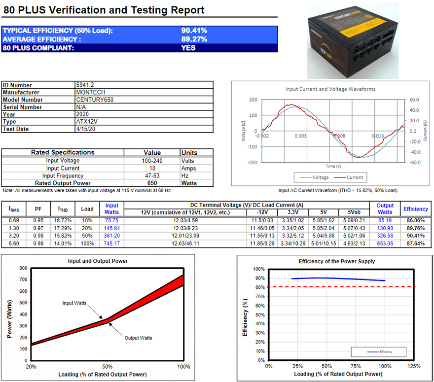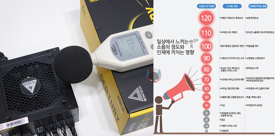그리고, 전력 효율에서 80플러스 골드등급을 받았기 때문에, 실제 80플러스 사이트에 등록된 센추리(Century) 650W 모델의 전력효율을 확인해보면, 평균 약 89%의 효율을 가지고 있는 것을 확인할 수 있어서, 골드등급답게 실사용 시스템에서도 낭비되는 소비전력이 적다고 할 수 있겠습니다. 끝으로, 기본작동상태에서 팬 소음을 측정해 본 결과도 약 43dB(A)수준으로 정숙한 편인데, 실제 PC케이스 내부에 장착하고 사용한다면 이보다 더 작게 들리기 때문에 소음 불만은 없겠습니다.