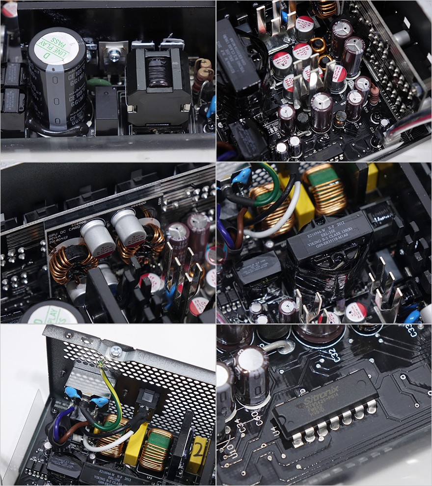 센추리(Century) 파워서플라이의 본체를 잠깐 살펴보면, 내부에 장착된 쿨링 역할의 120mm 팬은 파워서플라이 제품에 주로 많이 사용되고 있는 Yateloont사의 팬이 사용되었으며, 공기흐름을 잡아주기위한 에어가이드도 적용되어 있습니다. 그리고, 내부를 간단히 살펴보면, 효율적인 전력관리를 위해 ActivePFC가 기본적으로 적용되어 있으며, 메인캐피시터는 390㎌/400v 용량으로 일본산 니치콘사의 캐패시터가 사용되었으며, 부가적인 캐패시터들도 모두 일본산 제품으로 사용되어서 내부 구성은 탄탄하다 할 수 있습니다. 여기에 DC to DC 회로와 스위칭트랜스, 고주파음 최소화를 위한 EMI필터, 내부 전류흐름방지의 접지, OPP/OVP/OCP/SCP/OTP의 보호 회로를 적용하고 있습니다.