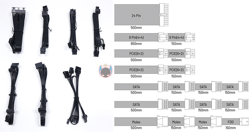 케이블 구성은 총 7개 구성으로 모두 인텔 파워서플라이 가이드 표준에 맞춘 18AWG 전선규격을 사용했는데, 케이블에 라벨표시도 모두 똑같은 위치에 깔끔하게 표시 처리되어 있어서 보기가 좋고, 전체적인 케이블 길이도 요즘 PC케이스 구조 그러니깐 파워서플라이 하단에 주로 장착되는 구조에 맞춰서 넉넉한 길이를 가지고 있어서, 길이에 대한 부족한 느낌을 들지 않겠습니다. 그리고, 커넥터 지원 역시 메인보드 전원 24핀을 비롯해, 보조전원 ATX 8(4+4)핀도 2개를 제공해주고 있어서 최근 출시되는 메인보드들이 보조전원 2개를 갖추는 경우가 많은 것을 고려했을 때 650W용량에서 좋은 지원이라고 할 수 있으며, 그래픽카드 보조전원 PCI-E 8(6+2)핀도 4개, S-ATA 커넥터도 8개, P-ATA 커넥터 3개, FDD 1개까지 전반적인 커넥터 지원 조화가 상당히 잘 되었다고 볼 수 있습니다. 물론, 케이블타입도 모두 플랫(Flat)타입으로 선정리를 하기에 좋구요.
