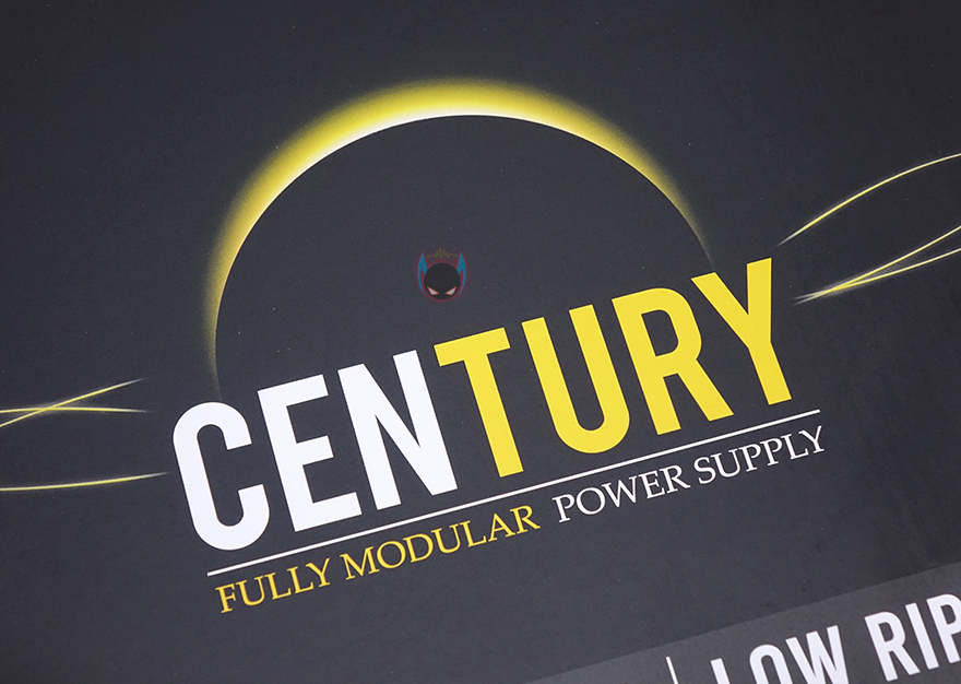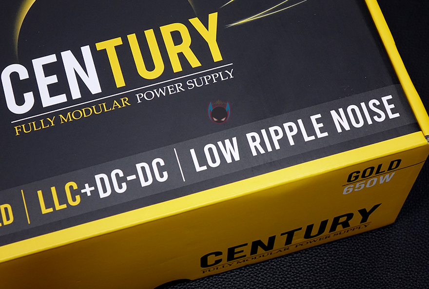 제품박스는 기본적으로 블랙색상에 포인트로 옐로우 색상을 조화시킨 디자인으로 박스 전체가 밀봉처리된 상태로 포장되어 있어서 소비자입장에서는 새제품임을 인지할 수 있어서 좋을 것 같고, 센추리(Century) 모델명과 함께 제품 특징 문구로 LLC 공진형 컨버터와 DC to DC 회로, 낮은 리플노이즈를 언급하고 있으며, 박스 측면에 좀 더 추가적인 특징과 반대쪽 측면에 제품의 기본 사양을 표기해놨습니다.