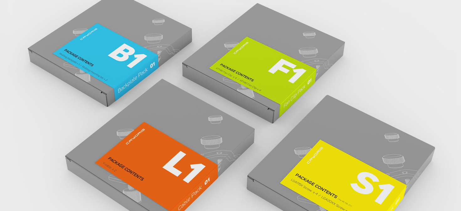 마지막으로 그동안 예전 CRYORIG CPU쿨러를 사용하면서 새로운 CPU가 출시되면서 바뀌는 소켓 규격으로 사용할 수 없었던 소비자들을 위해 스페어 키트가 출시될 예정입니다. 총 4가지로 구성되는 S1은 스크류, L1은 듀얼 팬 연결을 위한 Y자 케이블, F1은 XF140/XT140 팬 장착을 위한 클립, 마지막으로 B1은 백플레이트 구성을 담고 있습니다.