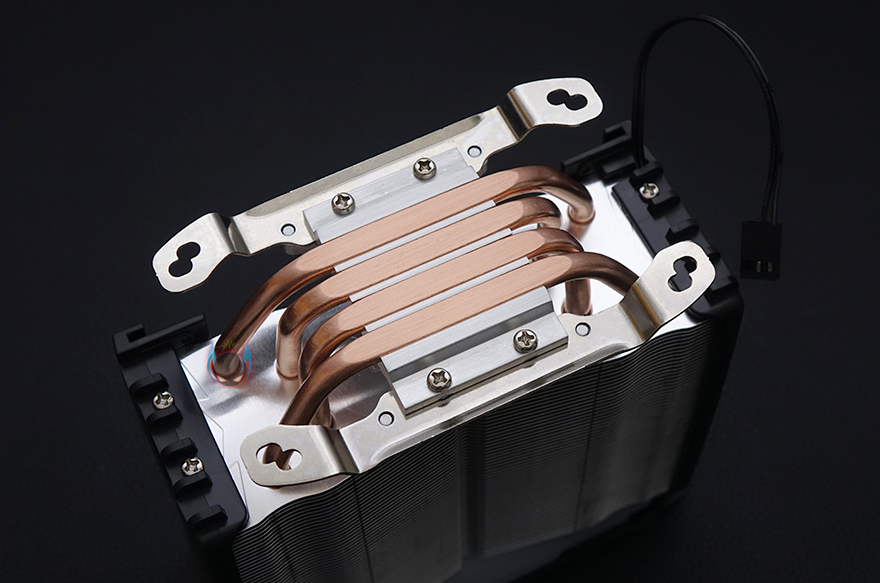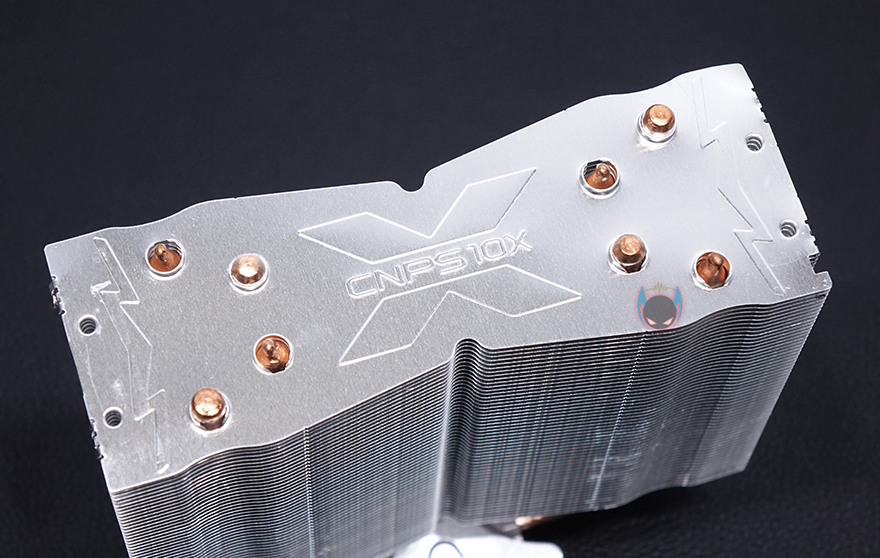 커버에서 분리된 순수 CPU쿨러 자체를 살펴보면, 방열핀은 총 56개가 사용되었으며, 일정간격을 유지하고 있고, 방열핀마다 중앙에 옵티마10X 시리즈명을 새겨놨습니다. 그리고, 방열핀을 통과하는 히트파이프는 모두 관통식이며, 히트파이프는 6mm 두께로 4개가 사용되었으며, CPU와 맞닿는 베이스부분에 그대로 드러내는 방식으로 직접 CPU에 접촉하는 DTH(Direct-Touch-Heatpipes)방식이며, 사용시에는 부착되어있는 투명 스피커는 떼고 사용해야합니다.