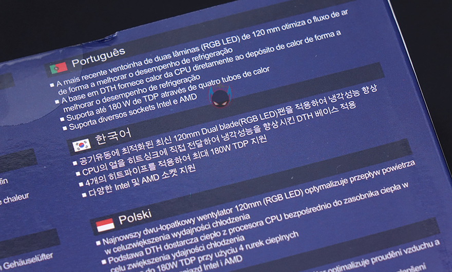 그리고, 박스뒷면에는 각 나라별 언어로 제품 특징을 표기해놨는데, 한국어도 포함이 되어있으며, 기본사양에는 표기되어 있지않던 TDP설계전력도 최대 180W까지 지원한다라는 것을 확인할 수 있습니다. 예전에는 소비자들이 CPU쿨러를 구입할 때 TDP설계전력 지원을 잘 확인할 필요가 없었는데, 요즘 출시되는 CPU들은 6코어이상으로 나오는 제품들도 많아져서, 오버클럭을 생각하는 소비자라면 이런 TDP설계전력 지원표기는 꼭 확인할 필요가 있겠습니다. 그리고, 박스를 열어 구성품을 꺼내다보면 CNPS10X OPTIMA II RGB(블랙) CPU쿨러는 흔들리지 않게 또한 외부 충격방지를 위해 우레탄-폼으로 포장된 것을 확인할 수 있으며, 쿨러를 비롯한 제품구성에는 120mm 팬, 부속품이 담긴 박스, 제품설명서로 이루어져 있습니다. 제품설명서는 한국어로 표기되어 있지않지만, 설치과정을 그림형태로 알아보기 쉽게 모두 그려놨기 때문에 장착시 참고할 때 어려움은 없겠습니다. 그리고, 부속품 박스에는 백플레이트를 비롯해 나사와 너트 등 장착에 필요한 기본 부속품들과 써멀컴파운드, Y자 케이블이 들어있습니다. 주요 부속품들은 분실이 되지않게 별개로 포장이 되어있습니다.