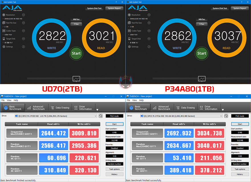 이 외에 추가적인 벤치마크를 통해서 UD70 SSD와 P34A80 SSD의 속도 성능을 비교해보면, 전반적으로 비슷한 성능을 보여주면서도, 조금은 P34A80 SSD가 좀 더 나은 것을 확인할 수 있어서, 역시 3D QLC와 3D TLC에 따른 차이가 있음을 짐작할 수 있습니다. 그래도, UD70 SSD 모델이 2TB 대용량이라는 점에서 가격대를 생각하면 성능은 상당히 만족스러운 결과라고 볼 수 있겠습니다.