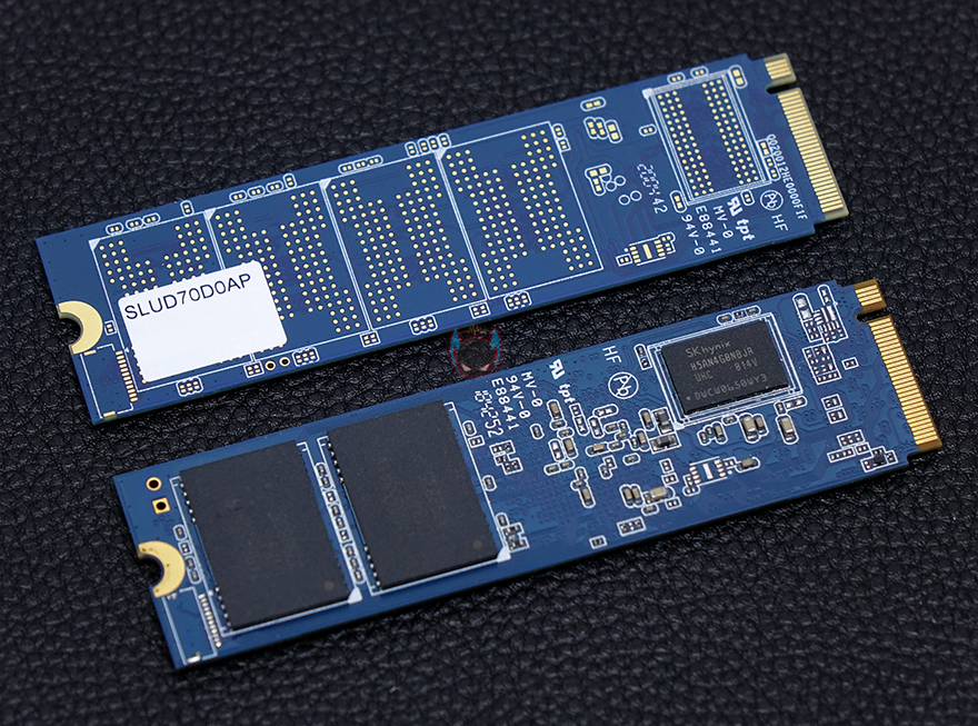 실리콘 UD70 SSD 외형을 살펴보면, 길이는 2280 사이즈이며, 외형적인 모습은 먼저 출시했던 P34A80과 유사합니다. 라벨스티커 부분에 용량 표기가 되어있는데, UD70 SSD는 500GB, 1TB, 2TB 3가지 용량별로 출시가 되었습니다. 참고로, P34A80은 256GB~2TB까지 출시했었죠. 그리고, PCB기판 뒷면을 보면 UD70은 추가적으로 적용된 칩들 없이 한면에 단면처리를 했습니다. 다시말해, 낸드플래시 메모리, 컨트롤칩셋, DRAM 같은 칩들이 모두 한 면에만 적용된거죠. 이는 역시 P34A80와 비교하면 쉽게 알 수 있습니다.
