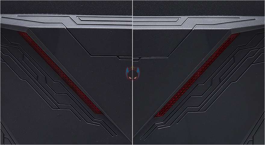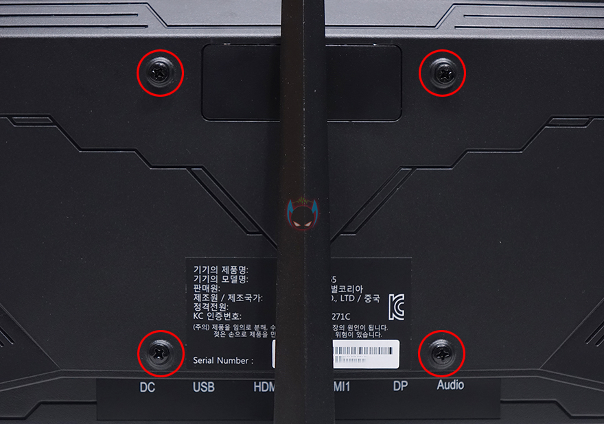 모니터 후면에는 윗부분에는 이트로이 로고를 새겨놨으며, 아랫부분에는 내부 AD보드에 따르 발열 배출을 위해 에어홀 처리를 해놨습니다. 그리고, 전면에서 봤을 때 오른쪽 뒷면에 전원버튼과 OSD메뉴 버튼들이 배치되어 있으며, 포트구성에는 오른쪽부터 전원 외장어댑터 포트, USB포트, HDMI 포트 2개, DP포트 1개, 헤드폰 포트로 구성되어 있습니다. 참고로 HDMI 포트를 사용했을 시에는 화면주사율 144Hz까지 지원하며, DP포트를 사용했을 시 최대 165Hz까지 설정할 수 있습니다. 조금 아쉬운 점이라면 후면 디자인으로 양쪽에 레드색상의 아크릴 디자인이 적용되어 있는데 기왕이면 LED효과까지 적용되었으면 좋지 않았을까 생각이 들었습니다. 그리고, 기본적으로 제공되는 스탠드를 조립해서 사용해도 되지만, 요즘은 모니터 암을 사용하는 분들도 많아져서 100x100mm 규격 베사홀도 지원해주고 있습니다.
