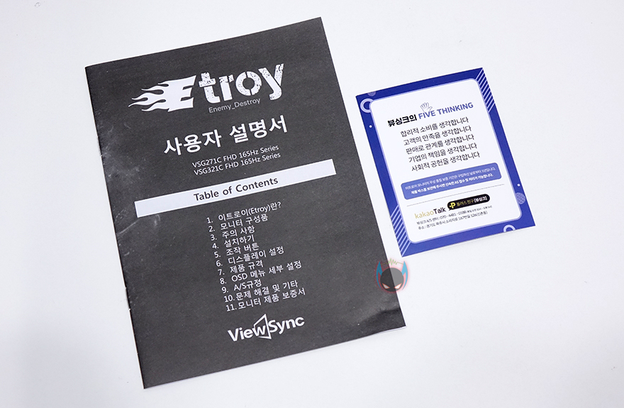 제품 포장은 모니터 패널부분이 파손되지 않게 앞뒤 전체로 스티로폼 포장을 했으며, 바깥쪽에 구성품들이 각각 비닐포장되어 있는데, 제품설명서를 비롯해, 제품보증서, 전원 외장어댑터&전원케이블, DP케이블을 기본으로 제공해주고 있습니다. 참고로 뷰싱크 이트로이 VSG271C165 모니터의 무상보증기간은 1년입니다.
