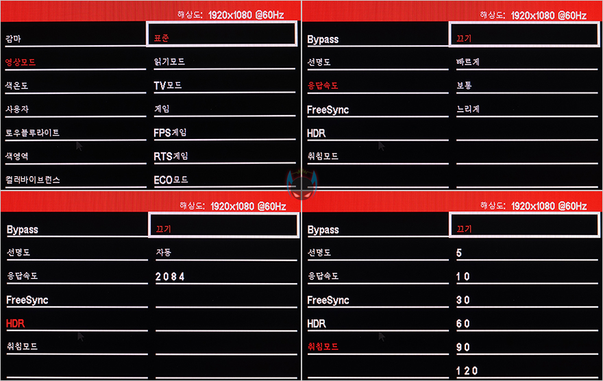 몇 가지 메뉴를 세부적으로 살펴보면, 영상모드 같은경우 표준/읽기모드/TV모드/게임/FPS게임/RTS게임/ECO모드 총 7가지 모드를 지원해주고 있는데, 실제로 화면상으로 보면 약간씩의 차이점들이 있음을 느낄 수 있고, 응답속도 같은경우 끄기, 빠르게, 보통, 느리게 총 4가지로 수치상으로는 확인할 수 없지만, 제품정보에선 1ms까지 지원하는 것으로 나와있습니다. 그리고, HDR도 끄기, 자동, 2084 3가지로 지원되는데, 사실 HDR은 400이상이 아니면 큰 의미가 없지만, 그래도 사용을 하고 싶다면 자동설정 후 윈도우에서도 HDR을 켜놓고 사용하거나, 2048만 선택해서 사용하면 되겠습니다. 참고로 HDR를 사용하게 되면, 영상모드는 따로 설정할 수 없습니다. 그리고, 리모컨이 별도로 제공되지는 않지만, 취침모드도 지원해주고 있어서 2시간까지 시간설정할 수 있습니다.