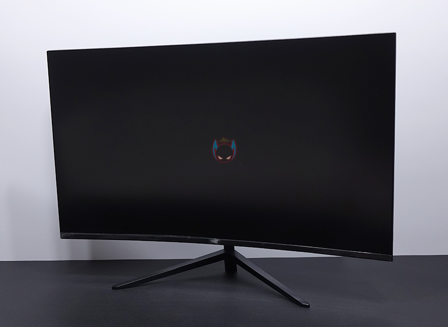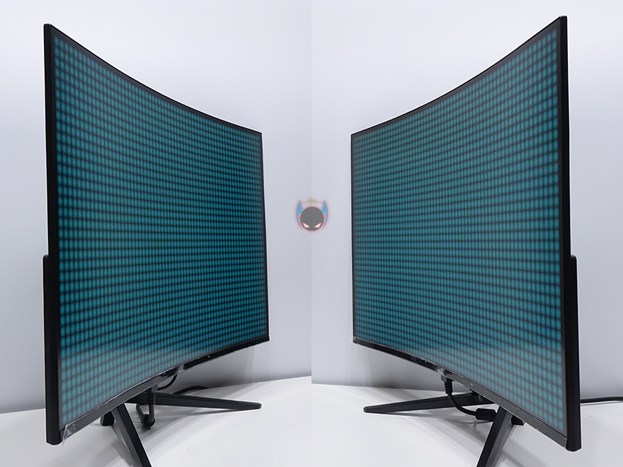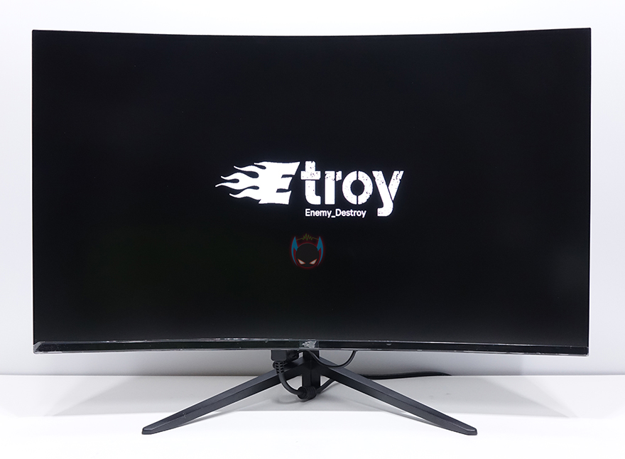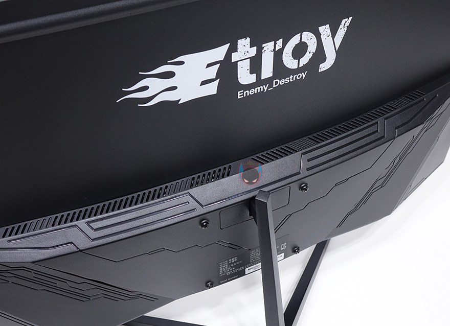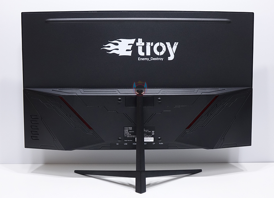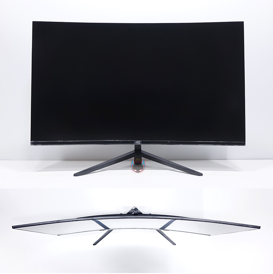 그럼, 뷰싱크 이트로이 VSG271C165 모니터의 외형을 살펴봅시다. 27인치 크기의 모니터로 전면에서 봤을 때, 올-블랙 느낌을 살리고 있으며, 위에서 보면 1500R 곡면율의 커브드가 적용된 것을 확인할 수 있습니다. 요즘은 1800R~1000R까지 다양하게 나오고 있어서, 이제는 커브드도 개인취향이 다양해지고 있습니다. 1500R 곡면율이면 일반적으로 소비자들이 많이 선택하는 곡면율대라 크게 호불호는 없다고 할 수 있겠습니다. 참고로 곡면율 수치가 작을수록 더 많이 휘어집니다. 그리고, 전면 테두리 베젤은 하단부를 제외하고는 모두 1mm대로 제로베젤 컨셉을 잘 살리고 있으며, 하단분 중앙에는 이트로이 로고 메탈릭스티커를 부착해놨습니다. 하반부에 개봉시 보호비닐도 부착되어 있기때문에, 사용자 취향에 따라 떼어낼지말지 선택해도 되겠습니다.