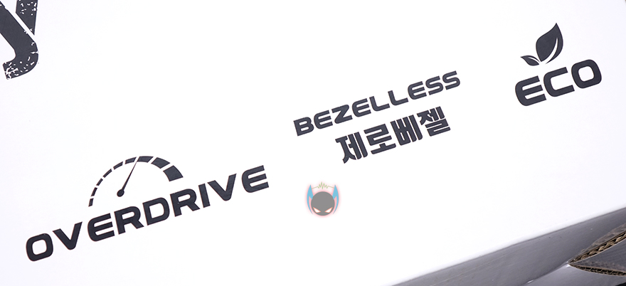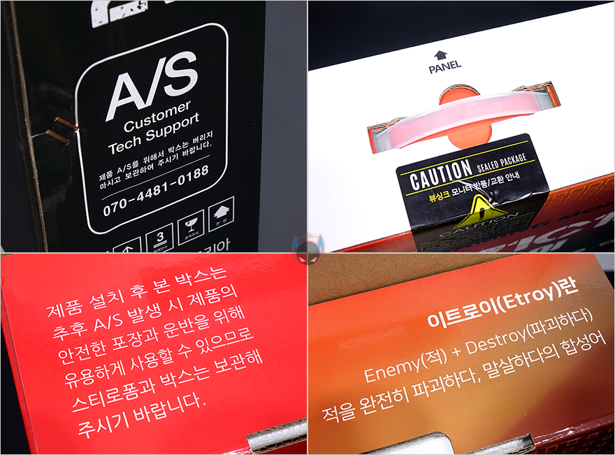 제품박스는 전후면 서로 대비되는 느낌으로 색상을 적용하는 동시에 모델명과 제품의 주요 특징을 표기해놨는데, 165Hz 화면주사율, HDR지원, 프리싱크 지원, USB, 커브드, 풀-HD(1920x1080)해상도, 조준선, 게임모드, 시력보호, 오버드라이브, 제로베젤, 친환경 인증을 대표적으로 표기해놨습니다. 요즘 왠만한 게이밍 모니터라면 갖춰야 할 기본적인 요소들을 거의 다 갖췄다고 볼 수 있죠. 이외에도 제품 A/S 관련 전화번호라든지 이동시 편의를 위한 손잡이 적용, 내부 포장된 모니터의 전면이 어느방향인지 등도 표시가 되어있고, 이트로이의 의미가 무엇인지도 제품을 개봉하다보면 자연스럽게 볼 수 있도록 표기해놨습니다.