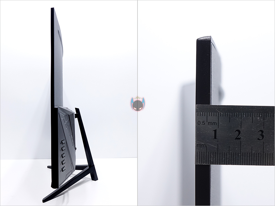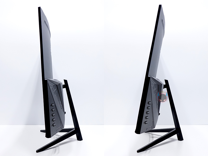 모니터 측면에서 보면 상위에서 중앙부분까지 매우 얇은 형태인 것을 확인할 수 있는데, 오로지 패널만 있는 부분으로 7mm 두께를 가졌습니다. 그리고, 아래로는 내부에 AD보드가 위치하는 구조를 가졌죠. 모니터 스탠드는 각도조절의 틸트기능만 지원해주고 있는데, -5~15도 범위에서 조절할 수 있습니다. 흔히 PC방 같은 곳에서 사용하는 모니터들의 각도조절 범위라고 보면 됩니다.