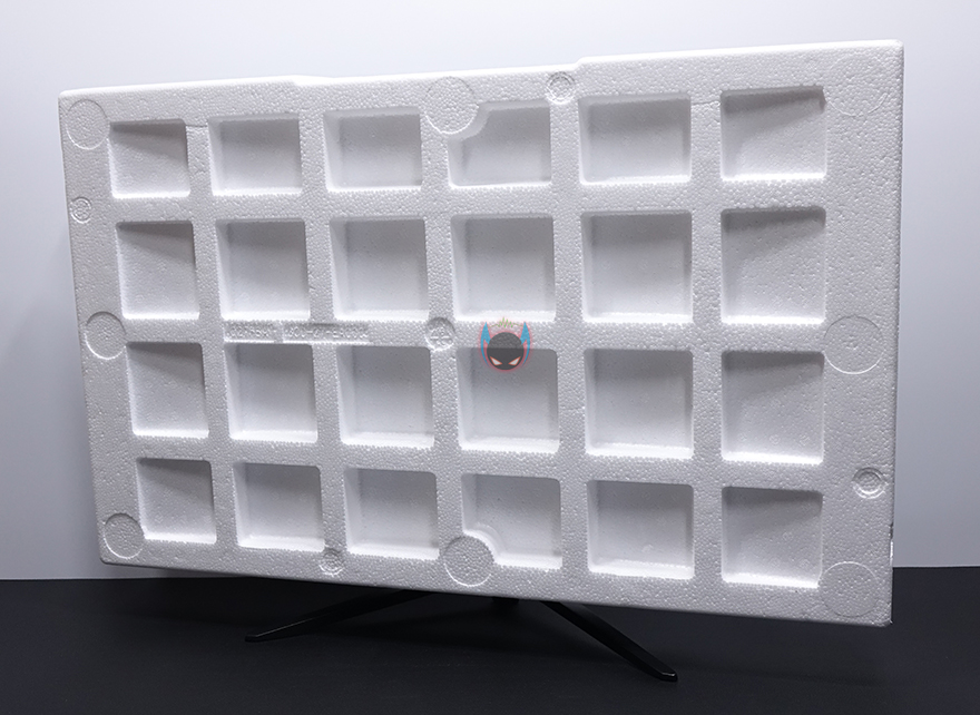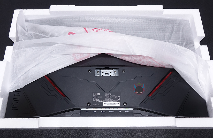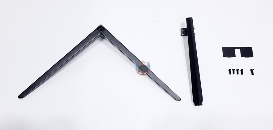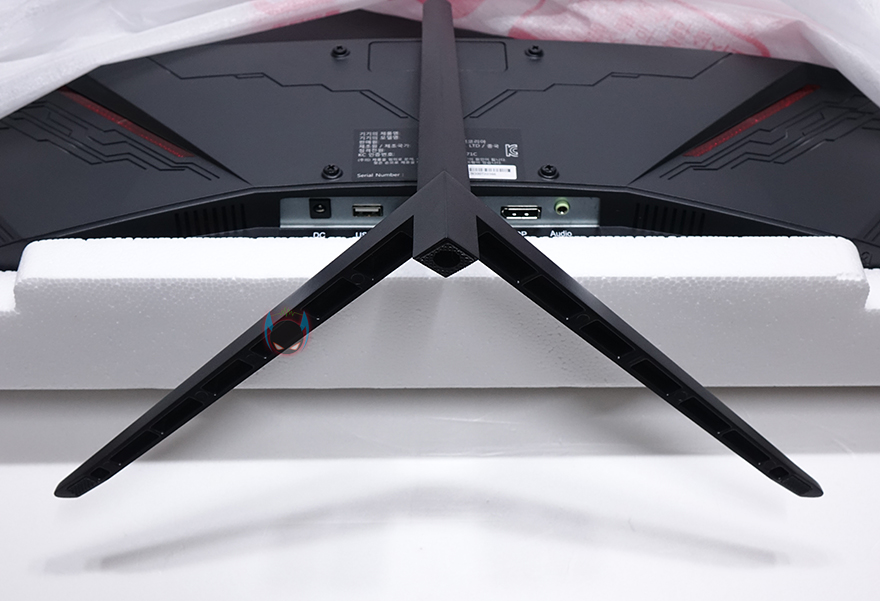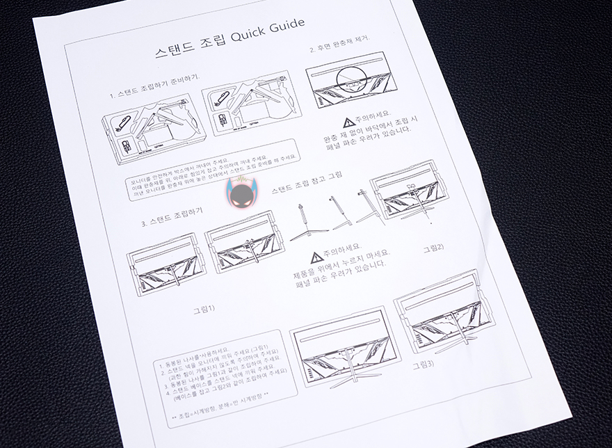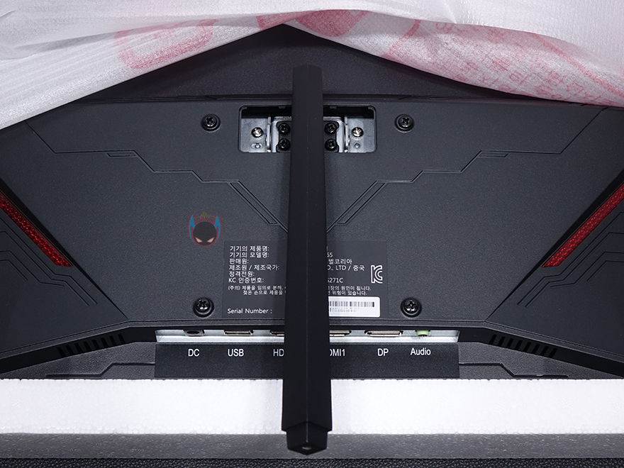 나머지 구성품들은 모니터 스탠드 부속품으로 스탠드조립 설명서가 제공되기 때문에 어렵지 않게 조립할 수 있는데, 일단 패널이 커브드이기때문에 스티로폼 포장에서 분리하지 말고 보호비닐만 반쯤 벗겨내면 후면 중앙부분에 스탠드 목부분을 결합해야하는 홈이 보입니다. 제공되는 나사 중 4개가 동일한 굵기이기 때문에 쉽게 구분되어서, 나사로 스탠드 목부분을 모니터 후면과 결합해주고, 제공되는 커버를 끼워주면 되죠. 커버는 열린 부분이 윗방향으로 해서 끼워주면 됩니다. 그리고, 나머지 스탠드 다리부분을 목부분과 제공되는 나머지 가장 큰 나사로 결합을 해주면 마무리가 됩니다. 물론, 다리 밑바닥부분에는 미끄럼방지 고무패드도 기본 부착되어 있고, 방바닥보다는 책상 같은 곳에 올려놓고 조립을 하면 다리까지 수월하게 조립할 수 있으니 참고하세요. 그리고, 조립 후에 세워서 스티로폼과 보호비닐을 벗겨내면 깔끔하게 마무리할 수 있습니다.