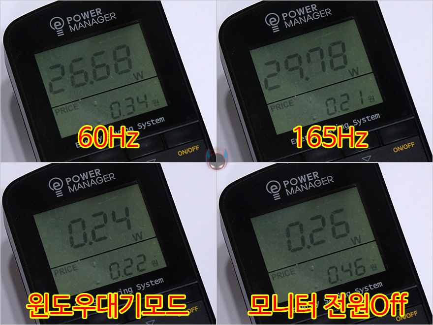 마지막으로 이트로이 VSG271C165 모니터의 소비전력을 측정해본 결과, 기본설정(밝기70)에서 화면주사율 60Hz과 165Hz 일 때 둘 다 30W미만으로 적은 편이며, 둘의 차이도 3W내외 수준입니다. 또한, 윈도우 운영체제상에서의 디스플레이꺼짐 대기모드와 모니터 자체의 전원버튼을 통한 Off 상태 모두 0.3W미만수준으로 스펙상의 대기전력보다 좀 더 낮은 수준으로 전기세에 대한 부담은 크게 가질 필요 없겠습니다.