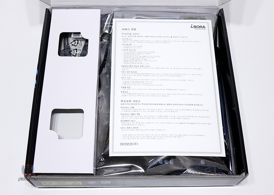 이 외에도 팬 속도조절을 할 수 있는 FAN Xpert 2+와 USB 3.1 2세대 타입 A 포트 지원, M.2 SSD PCIe 3.0 x 4레인 지원도 언급을 하는데, 이부분은 뒤에서 메인보드 레이아웃을 살펴보면서, 다시 한 번 언급하겠습니다. 그리고, 박스를 열어보면 수입사인 아이보라의 서비스 규정에 대한 약관을 먼저 확인할 수 있으며, 제품 구성에는 정전기방지 비닐에 포장된 프라임 B450M-A 메인보드와 백패널 I/O 쉴드, M.2 SSD슬롯 나사, S-ATA 케이블 2개, 드라이버 CD, 제품 설명서 및 퀵 가이드 제공으로 이루어진 것을 확인할 수 있습니다.