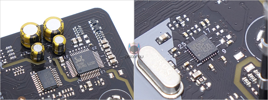 오디오와 랜 칩셋은 모두 리얼텍(Realtek)사의 칩셋이 사용되었고, 오디오 같은 경우 캐패시터에는 일본산(니치콘)이 사용되었습니다. 그리고, 독립된 PCB 분리로 라인에 따라 LED 효과도 볼 수 있습니다. 또한, 앞에서 말했듯이 네트워크 지원 같은 경우 랜 포트 보호를 위해 EMI 쉴드 랜가드가 적용되었고, 바로 옆에 팬 커넥터가 1개 배치된 것도 확인할 수 있습니다. 또한, 백패널의 D-SUB 출력포트 칩셋으로 역시 리얼텍사의 칩셋이 사용되었고, 역시 앞에서 주요 특징을 언급했던 USB 3.1 2세대 타입 A포트 지원을 위해 페리콤사의 칩셋이 사용된 것도 확인할 수 있습니다.