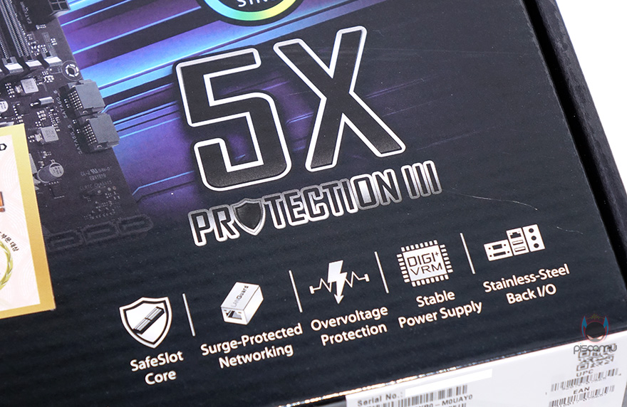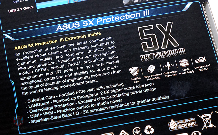 이 밖에도 박스 전후면에는 제품의 기본 스펙 사양과 주요 특징들을 소개하고 있는데, 일단 박스 후면에는 제품의 이미지와 함께 주요 부분에 부품 지원 표기와 스펙 사양 표기를 상세하게 표기하고 있어서 구입 전에 충분히 도움을 주도록 해놨으며, 주요 특징에는 먼저 ASUS의 보호기술 집약체라 할 수 있는 '5X Protection III'를 소개하는데, 쉽게 말해 슬롯, 네트워크, 과전류 및 과전압 방지, 백패널 부분 이 5가지의 보호기술을 의미하고 있습니다. 슬롯 같은 경우에는 PCI-e 슬롯의 견고한 솔더링처리, 네트워트 부분은 인터넷 랜 포트 보호를 위한 EMI쉴드 랜가드, 백패널은 I/O 쉴드에 스테인리스 재질이 사용되었다라는 것을 이야기합니다.