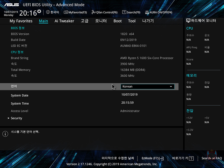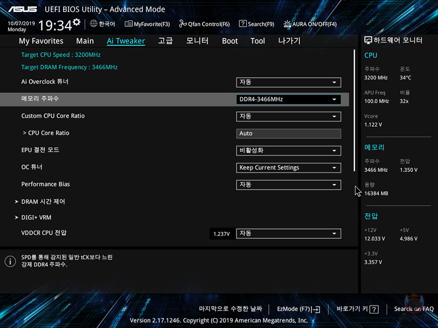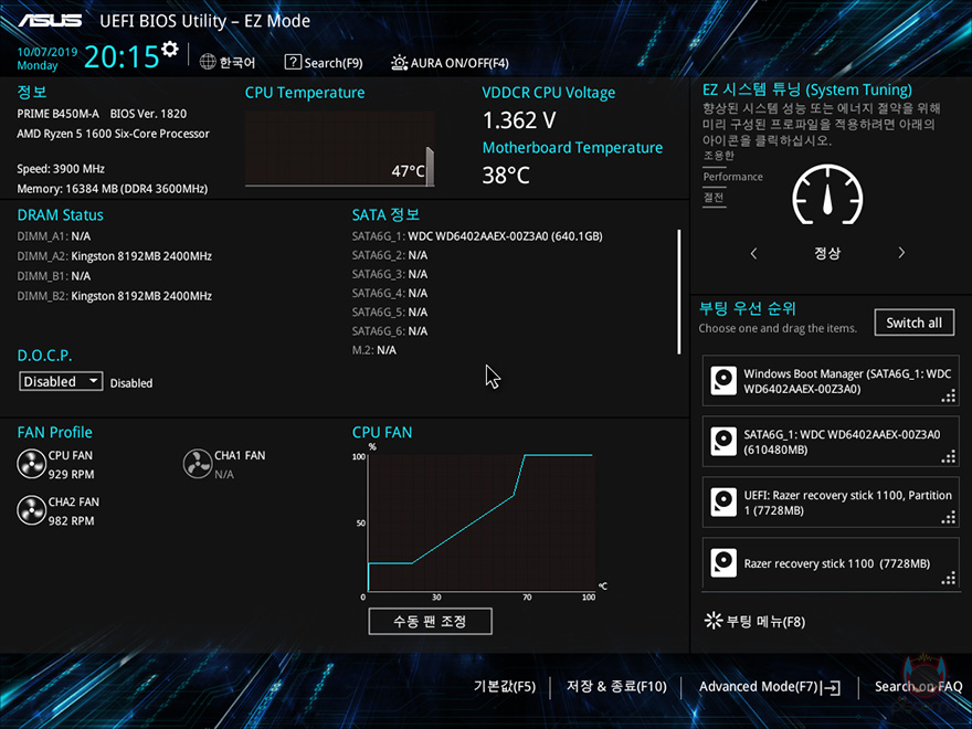 그리고, 오버클럭 지원 능력을 확인하기 전에 CMOS 메뉴를 잠깐 살펴보면, UEFI 바이오스이기 때문에, 다른 경쟁사 메인보드들과 마찬가지로 UI 인터페이스가 Ez모드와 어드밴스 모드 2가지로 나뉘어지고 있어서, 사용하기 편한 모드로 선택해서 CMOS 메뉴들을 보면 됩니다. 모드 전환은 F7이고, 한국어도 지원합니다. 또한, CMOS 자체에서도 쿨링 지원으로 팬 속도조절을 할 수 있게 Q-팬 제어가 지원되고 있습니다.