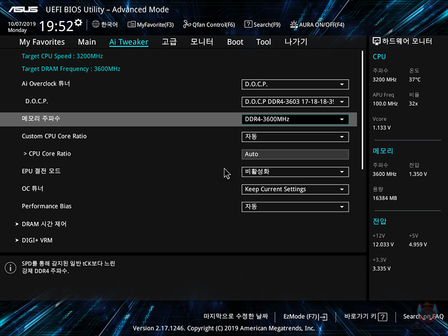 이번에는 메모리(RAM)의 오버클럭 지원 능력을 확인해봤는데요, 사실 이부분이 개인적으로는 메인이라고 생각하고 있습니다. 왜냐하면 시중에 판매되고 있는 B450칩셋의 메인보드들이 많고, B450칩셋이 오버클럭을 지원하고 있지만, 메모리 오버클럭 같은 경우 3200MHz 클럭을 넘기기가 쉽지 않기 때문입니다. 보통 3200~3466MHz라고 표기는 해놓지만, 안되는 경우가 다반사이기 때문입니다. 근데, 프라임 B450M-A 같은 경우는 확인해본 결과, 일단 스펙상에 표기된 최대 클럭 3466MHz까지 손쉽게 성공하는 것을 볼 수 있었고, 내친김에 그 이상인 장착된 메모리의 원래 최대클럭 3600MHz까지도 오버클럭을 해봤는데, 성공을 했습니다. 좀 특이한 점이라면, XMP프로파일을 메인보드에서도 지원하기 때문에 불러올 수 있는데, 이 XMP 프로파일의 메모리 오버클럭 설정보다 그냥 수동으로 오버클럭 설정하는게 더 성공율이 높습니다. 위에 CPU 오버클럭와 메모리 오버클럭 모두 종합적으로 보면 저가형 B450 메인보드임에도 오버클럭이 잘 된다라는 느낌이 받아서, 상당히 만족스러웠습니다.