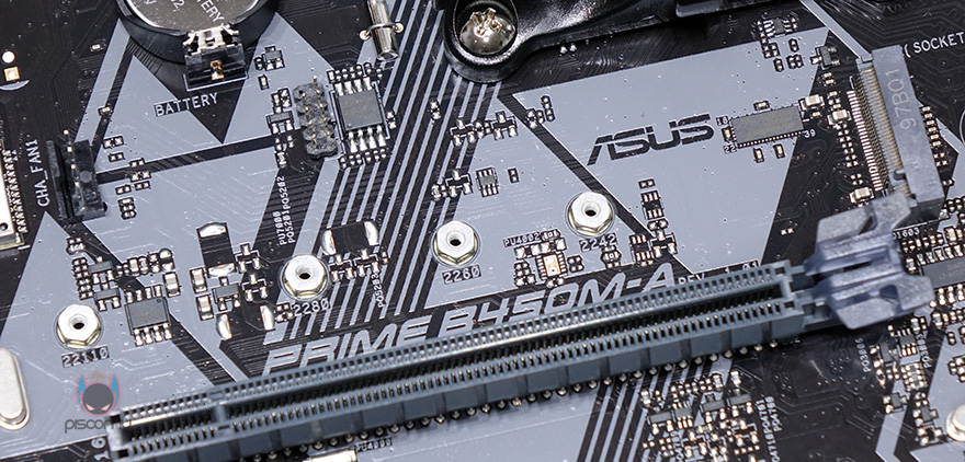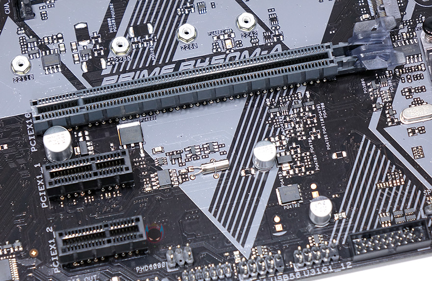 그럼, 이제 본격적으로 ASUS 프라임 B450M-A 메인보드 레이아웃을 살펴보록 하죠. 전형적인 마이크로-ATX(M-ATX) 크기 규격을 가지고 있으며, 10만원 아래의 저가형 모델이기 때문에 CPU 주변에 배치되는 전원부에는 별도의 방열판이 적용되어 있지 않습니다. 일부 소비자들은 이부분이 아쉽다 할 수 있겠지만, 사실 B450칩셋의 메인보드 같은 경우 mini-ITX 메인보드를 제외하고는 디지털전원부를 갖추고 있는 것이 아니기 때문에 높은 오버클럭을 지원하지 않습니다. 무난한 오버클럭과 공랭 CPU쿨러를 사용한다면, 전원부에 방열판이 없어도 충분히 쿨링해결이 됩니다. 전원부는 총 6페이즈 구성으로 1페이즈당 3~4 모스펫 구성을 하고 있으며, 전원부에 캐패시터는 대만산(APAQ사)이 사용되었고, 그 외에 주요 기타 캐패시터에는 일본산(니치콘)이 사용되었습니다. 그리고, ASUS 메인보드라면 필수로 적용된 전력컨트롤 칩셋 DIGI+VRM&EPU가 적용된 것도 확인할 수 있습니다.