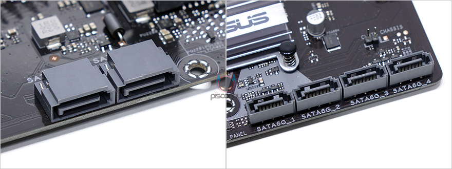 메모리 슬롯은 4개 구성으로 최대 64GB 용량까지 지원하고 있으며, 클럭은 최대 3466MHz라고 ASUS 홈페이지에 명시되어 있는데, 이부분은 뒤에서 다시 확인해보도록 하겠습니다. 그리고, 슬롯 오른쪽에는 FAN 커넥터 2개와 ASUS 아우라 싱크 지원을 위한 RGB 헤더가 배치되어 있는데 12V RGB 헤더입니다. 개인적으로는 5V RGB 헤더였으면 더 좋지 않았을까 생각이 드네요. 그리고, S-ATA 커넥터 지원은 총 6개 구성으로 이제는 기본이 S-ATA III (6Gb/s) 지원 인터페이스로 사용되고 있죠.