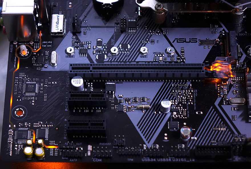 그럼, 이제 프라임 B450M-A를 직접 사용해봐야겠죠. 메인보드는 성능에 영향을 주는 부품이 아니기 때문에 일반적인 벤치마크 진행은 제외하고, B450칩셋 특성상 오버클럭 지원 능력과 M.2 SSD를 PCIe 3.0 x 4레인까지 지원하기 때문에 이부분에 대한 성능을 체크해볼텐데요. 그전에 앞서 백라이트 지원에 대해서 확인해본 결과, 일단 오디오부분의 독립된 PCB라인과 PCI-ex16배속 슬롯 락(Lock)부분에는 오렌지 색상의 LED가 적용된 것을 확인할 수 있습니다. 그리고, ASUS RGB백라이트 연동기술인 아우라 싱크 역시 지원하고 있어서, 메모리나 FAN, 그래픽카드 등 연동이 지원되는 부품을 사용한다면 최대 13개의 모드 효과를 연동해서 볼 수 있겠습니다.