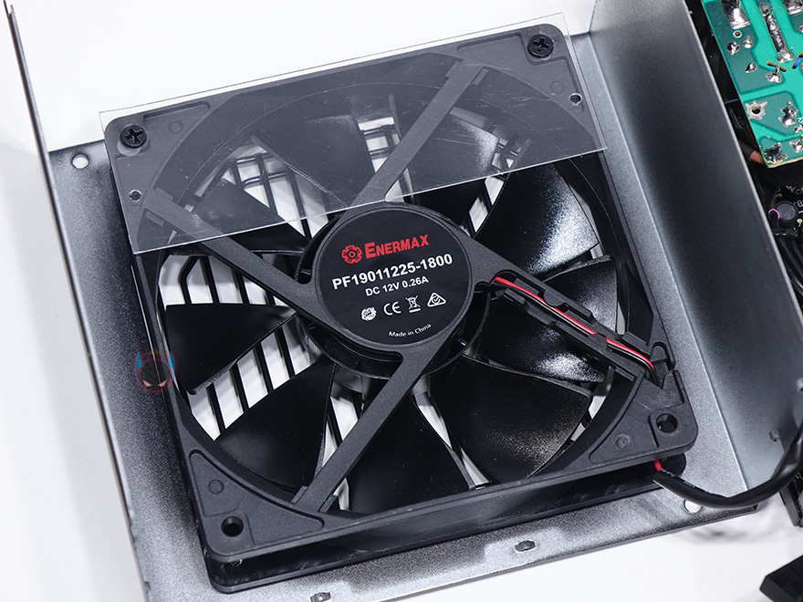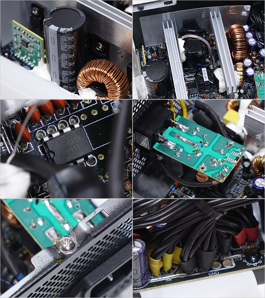 애너맥스 맥스프로2의 내부를 잠깐 살펴보면요, 내부 쿨링을 위해 120mm 팬이 장착되었는데, 보통 이름있는 경쟁사 제품들을 봐도 이부분은 별도의 쿨링팬 제조사 제품들을 사용하는 경우가 많은데, 애너맥스는 파워서플라이뿐만 아니라 쿨링팬 제품들도 다양하게 갖추고 있기 때문에 자사의 제품을 사용했습니다. 그리고, 내부 공기흐름 방향을 위해 에어가이드도 장착되어 있구요. 또한, 내부에는 400v/330㎌(마이크로패럿)용량의 일본산 메인 캐패시터, 전력효율을 위한 Active PFC, 안정적인 전력 출력을 위한 스위칭트랜스, 알루미늄 히트싱크, 5가지 보호장치가 적용된 보호회로, 고주파음 최소화의 EMI필터, 접지, 깔끔하게 마감된 케이블 출력부를 확인할 수 있습니다. 전체적으로 내부구성은 기본에 충실했다 볼 수 있습니다.