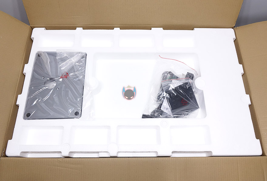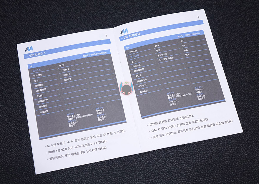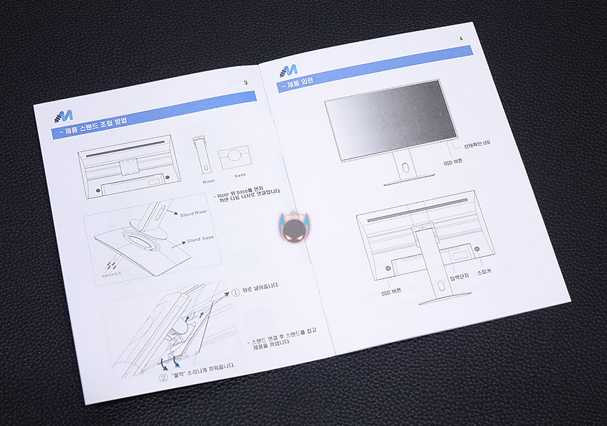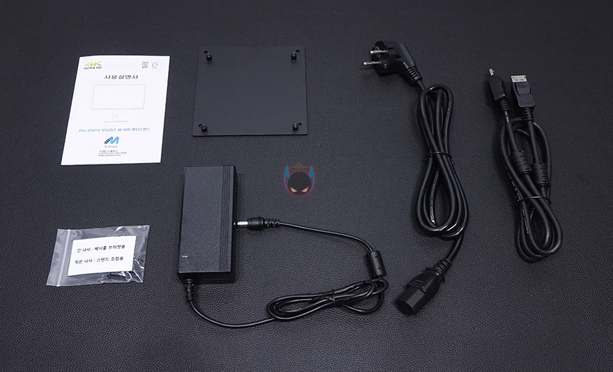 스티로폼 포장 1개를 벗겨내면, 이렇게 모니터 부분과 스탠드가 나란히 포장된 것을 확인할 수 있죠. 이렇게 옆으로 나란히 포장이 되어있기 때문에 제품박스가 큰 편입니다. 그리고, 나머지 부속품으로는 제품설명서, 나사, 벽걸이 VESA 브라켓, 전원어댑터&케이블, DP 케이블을 제공해주고 있는데, 외장형 어댑터지만 무게는 200g정도밖에 되지않아서 외장형 어댑터라서 무겁겠다고 생각했던 분들에게는 조금 반가울 수도 있겠습니다. 제품설명서는 모두 컬러인쇄로 제품사양부터 OSD메뉴까지 담겨있어서, 초보자라면 한 번 챙겨보는 것도 좋겠죠.