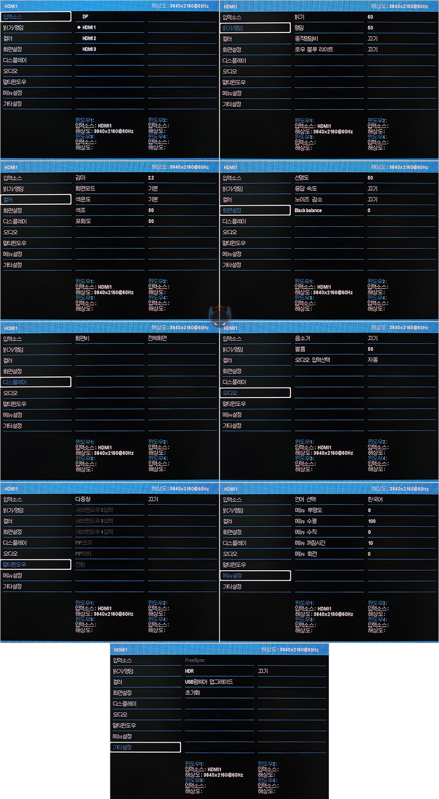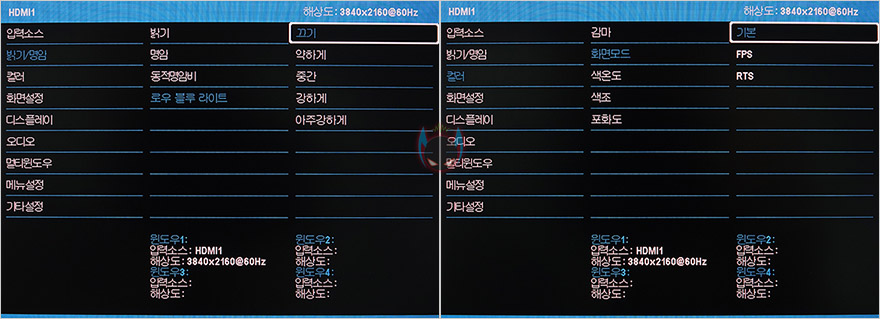 Flex 32UF10 모니터의 OSD 메뉴를 잠깐 살펴보면, 뒤에서 언급하겠지만 애초에 게이밍 모니터 컨셉보다는 전문가용 모니터에 사용되는 패널이기 때문에 OSD 메뉴에 게임요소의 부가적인 기능들은 많지 않습니다. 기본적인 밝기조절부터 컬러조절, 선명도, 화면비율, 오디오, 다중화면, OSD 메뉴설정, 펌웨어 지원 외에 블루라이트, 화면모드, HDR 지원정도가 부가적인 기능이라 할 수 있는데, 블루라이트는 TÜV 같은 인증을 받은 것은 아니지만, Off를 포함해 총 5단계로 조절할 수 있게 지원하면서 단계별로 차이도 느껴집니다. 화면모드 같은경우에는 기본/FPS/RTS 3가지 모드를 지원하고, HDR은 HDMI로 연결했을 시 사용할 수 있습니다. 전 작업용 목적으로 선택했기 때문에 개인적으로 아쉬운 부분이 아닌데, 게임용으로 생각한 소비자라면 프리싱크(Freesync)도 지원을 하는데 프리싱크를 사용하려면 DP포트를 사용해야합니다. 그러니깐 HDR과 프리싱크 둘 다 함께 사용할 수 없다라는거죠. 물론, HDR 같은경우 HDR10 지원이라 크게 의미가 없습니다. 제대로 HDR을 체감할려면 최소 HDR600/1000은 되어야하니깐요. 그래서, 굳이 이 모니터를 게임용으로 생각한다면 DP포트 사용을 추천합니다. (참고로 HDR, 프리싱크 모두 정식으로 인증을 받은건 아닙니다. 인증까지 받았으면 이 가격에 만나볼 수 가 없죠^^;) 그리고, 3W 스테레오 스피커를 갖추고 있다고 했는데, 외부 스피커를 따로 사용하는 분이라면, OSD 메뉴-오디오 설정에 음소거 기능이 있기때문에 모니터 스피커를 끌 수 있습니다.