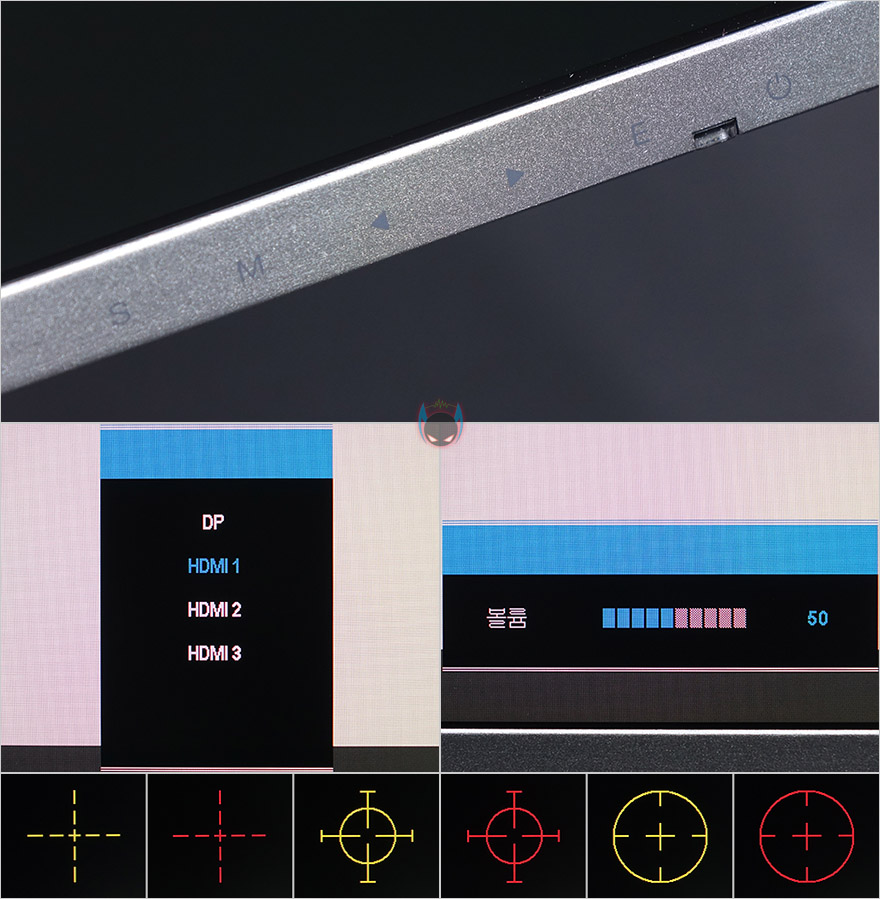 이외에 OSD 메뉴 버튼 중 바로 실행되는 기능도 있는데, S버튼을 누르면 모니터 포트에 연결된 외부 장치가 2개이상일 경우 외부입력 전환을 할 수 있으며, ◀버튼을 누르면 볼륨조절로 볼륨조절 화면이 뜨면 ◀,▶ 버튼으로 조절하면 됩니다. 그리고, ▶버튼을 누르면 조준선 표시로 일반 게이밍 모니터처럼 2가지 색상에 3가지 형태로 각각 보여줍니다.