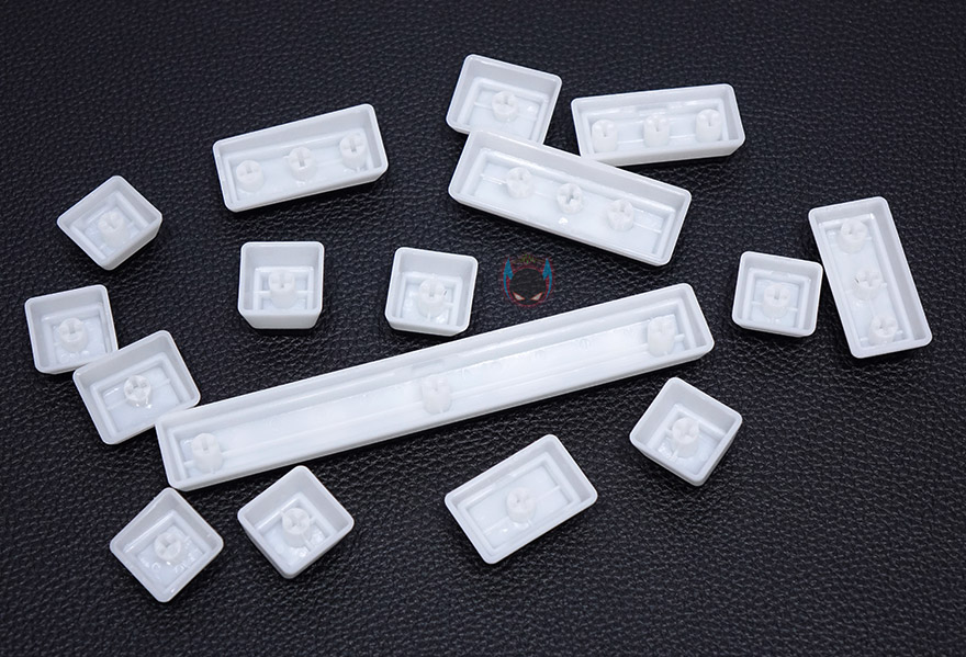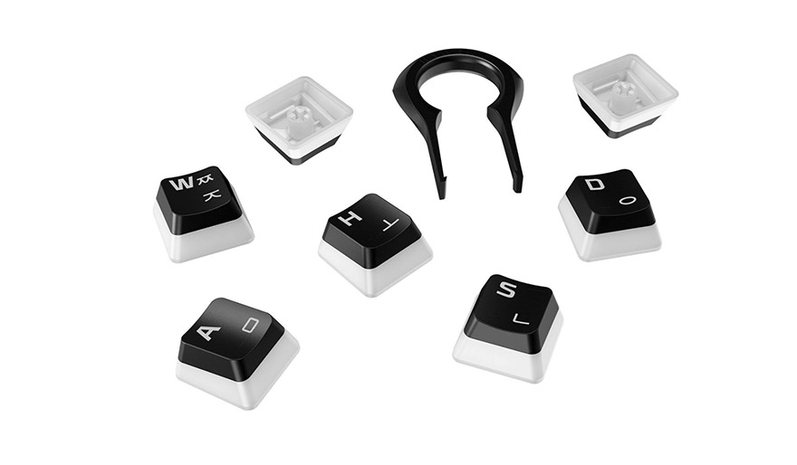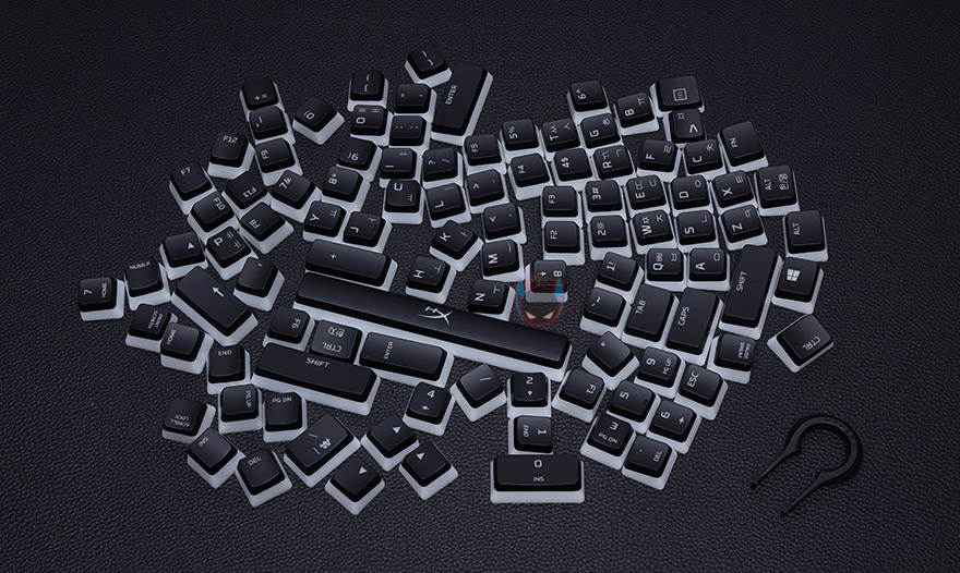 HyperX 푸딩 키-캡을 디자인을 살펴보면, 기존의 이미 키보드 덕후들이 애용하던 푸딩 디자인을 그대로 반영하기 때문에 특별한 건 없는데, 푸딩이라는 것이 반반 디자인으로 윗부분은 우리가 흔히 백라이트 키보드에서 볼 수 있는 폰트부분만 백라이트를 투과하는 디자인으로 처리되어 있고, 나머지 아랫부분은 전체효과를 볼 수 있게 반투명으로 처리된 것이 푸딩 키-캡의 디자인입니다. 그리고, 기계식키보드 스위치에 맞게 키-캡 안쪽은 +자 모양의 홈으로 처리되어 있기때문에, 꼭 HyperX의 Alloy 키보드 시리즈가 아니더라도 기존 체리스위치나 +자 모양의 스위치를 갖춘 키보드면 대부분 호환 사용이 가능하겠습니다. 재질은 ABS 재질입니다.