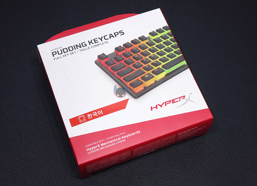 키보드 액세서리 제품이기때문에 특별한 건 없고, 액세서리 제품답게 박스에는 모델명과 제품 이미지를 담고 있어서 쉽게 푸딩 키-캡에 몰랐던 소비자도 쉽게 이해할 수 있겠습니다. HyperX에서 이 푸딩 키-캡을 출시한 이유는 초창기 HyperX의 Alloy 키보드 시리즈들이 우리가 흔히 보는 일반 키-캡 그러니깐 폰트부분만 백라이트 효과를 볼 수 있는 키-캡이었기때문에, 액세서리 이 푸딩 키-캡을 출시했는데, 자판별로도 판매되고 있어서, 초반에 HyperX 제품들이 영문 자판으로 판매되고 있어서 영문 자판을 구입했던 소비자들에게는 한글 자판으로도 변경할 수 있는 추가 이득이 있다 할 수 있겠습니다.