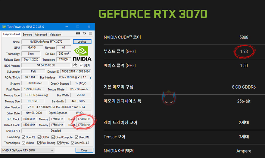 끝으로, Palit 지포스 RTX3070 GamingPro OC 그래픽카드는 이미 앞에서 확인한대로, 레퍼런스의 지포스 RTX3070 보다 부스트클럭이 높습니다. 하지만, 시중에 판매되고 있는 비레퍼런스 지포스 RTX3070 제품들 중 최대 부스트클럭은 1845MHz를 가졌기 때문에, 이 Palit 지포스 RTX3070 GamingPro OC 모델도 추가적인 오버클럭이 더 되는지 확인을 해봤습니다. 확인결과, 충분히 시중에 판매되는 지포스 RTX3070의 최대 부스트클럭까지 쉽게 적용되는 것을 확인할 수 있었고, 벤치마크를 통해서 성능이 더 향상된 것도 확인할 수 있었습니다. 그리고, 온도도 여전히 착한 수준인 것을 확인할 수 있었죠. 이미 오버클럭이 적용된 모델인데, 추가로 오버클럭이 더 되기 때문에 소비자입장에서는 충분히 매리트가 있다고 생각합니다.