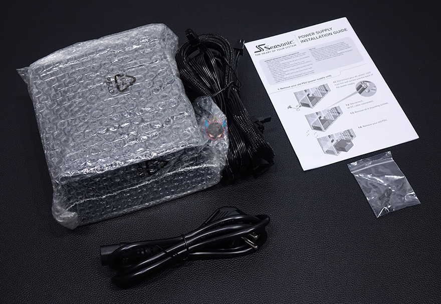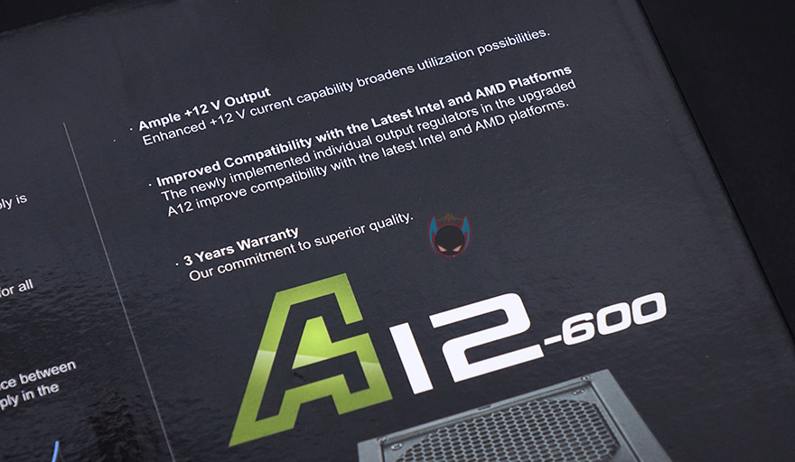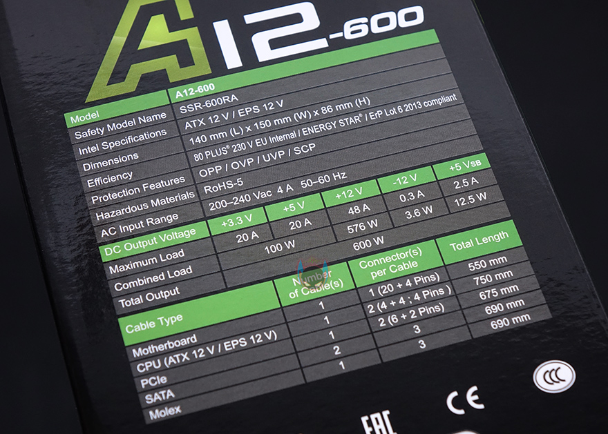 이 밖에 박스 한쪽 측면에는 제품 주요 특징을 각 나라별 언어로 표기해놨는데, 한국어도 포함되어 있으며, 다른 한쪽 측면에는 제품의 기본 사양을 표기해놨는데, 크기부터 보호회로, +12V 싱글레일, 커넥터 수, 케이블 길이까지 상세하게 표기해놔서 구입 전 충분히 도음이 되겠습니다. 박스 후면에는 80플러스 인증에 따른 전력효율에 대한 언급을 하고 있으며, 박스를 열어보면 외부 충격방지를 위해 우레탄-폼으로 포장을 해놨으며, 제품구성은 A12-600 파워서플라이, 제품 설명서, 전원케이블, 장착에 필요한 나사 제공으로 이루어져 있습니다.