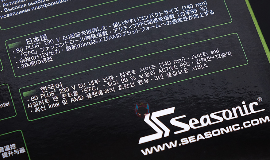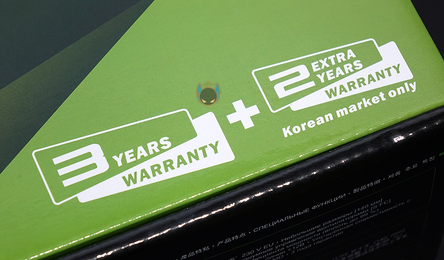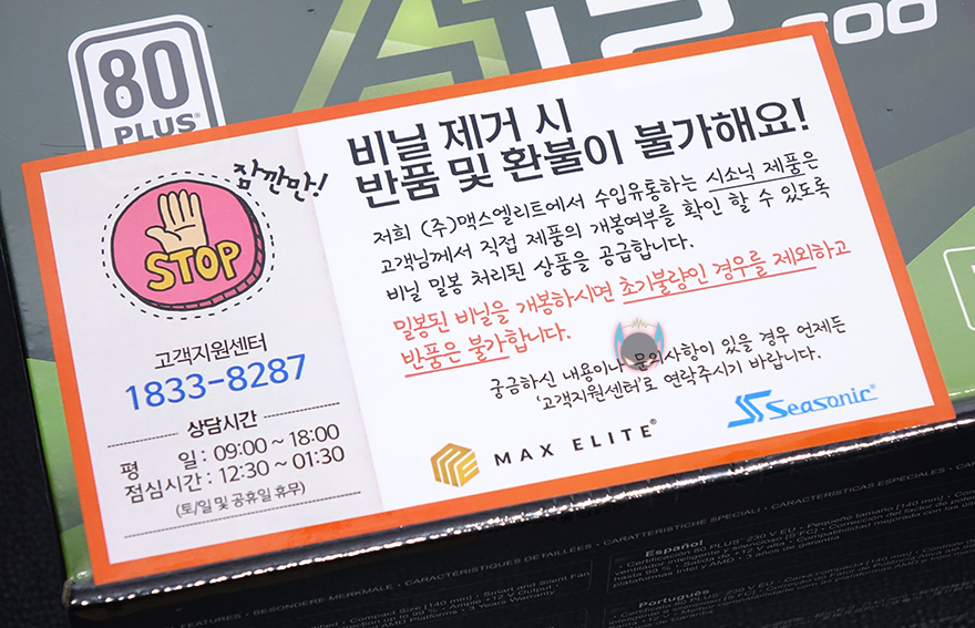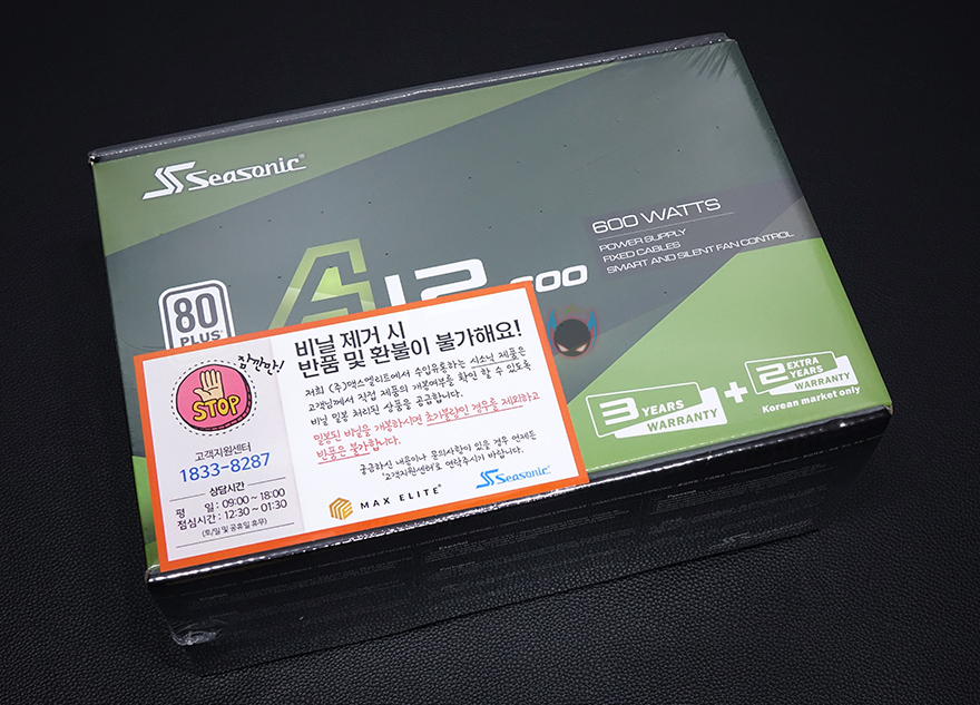 제품박스부터 살펴보면, 박스 전체가 비닐밀동처리된 상태인 것을 확인할 수 있습니다. 이 역시 국내브랜드보다는 해외브랜드 파워서플라이 제품들 이런 포장방식을 많이 적용하고 있는데, 소비자입장에서 판매제품에 대한 신뢰를 가질 수 있게 해주는 좋은 포장방식 중 하나입니다. 여기에 국내 정식수입사인 맥스틸(www.maxtill.co.kr)의 포장 관련 문구도 부착되어 있어서 구입시 소비자가 충분히 인지할 수 있도록 해주고 있습니다. 박스 전면에는 모델명과 80플러스 스탠다드 등급 표기를 확인할 수 있고, 제품 무상 보증기간을 확인할 수 있는데, 시소닉 자체의 3년 보증기간과 한국시장에만 적용되는 추가 2년 보증기간을 더해 총 5년의 무상 보증기간을 지원해주고 있습니다. 시작에서 한국시장을 고려했다는 부분이 바로 이런 부분입니다. 사실 해외시장에서는 보급형 모델에 대해서 보증기간이 보통 3년입니다. 하지만, 국내에선 국산 브랜드 파워서플라이 제품들이 경쟁을 위해서 보급형 제품에도 무상 보증기간을 최근 길게 지원해주고 있어서, 시소닉 역시 이런 점을 반영해 한국시장에서 경쟁하기 위해 추가 보증기간을 더해주고 있는겁니다. 소비자입장에서는 좋은점일 수 밖에 없죠.