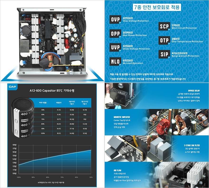 소비자입장에선 내부를 따로 분해해볼 수 없기때문에, 상품페이지를 참고해 내부를 확인해보면, 과전압, 과전력 등의 보호회로는 총 7가지가 적용되었으며, 메인 캐패시터는 대만의 TEAPO사를 사용했는데, 조금 아쉬운 점은 요즘 경쟁사의 보급형 모델에서도 동급회사의 105℃ 캐패시터를 사용하는 제품들이 많은데, A12-600에선 85℃ 캐패시터를 사용했습니다. 물론, 요즘 파워서플라이 내부 온도가 많이 올라가지는 않습니다. 그리고, 이밖에도 알루미늄 히트싱크도 적용되어 있고, 고주파음 최소화를 위한 EMI 필터, 안정적인 출력전압을 위한 마그네틱 증폭기 등의 탄탄한 기본기를 갖추고 있습니다.